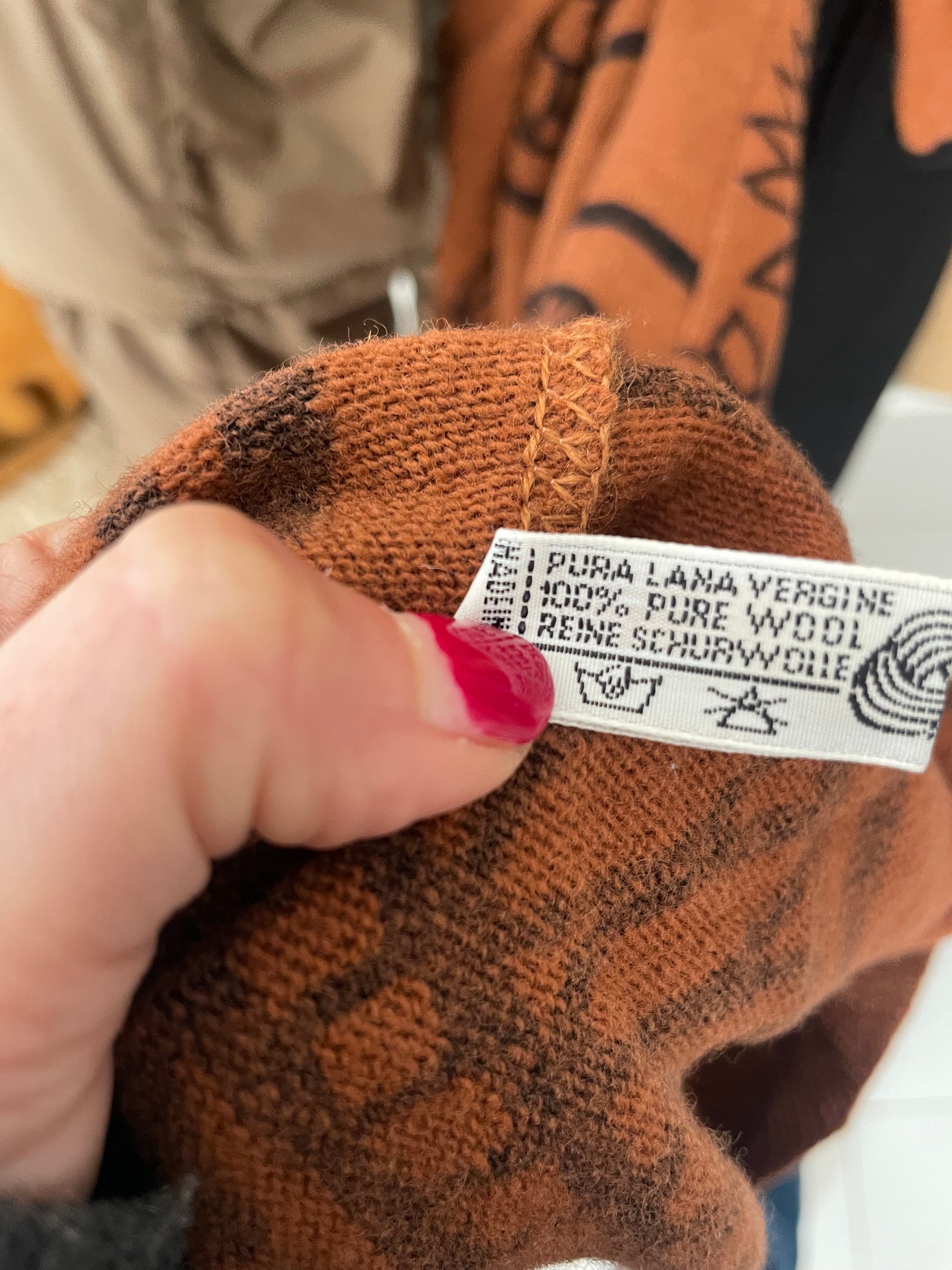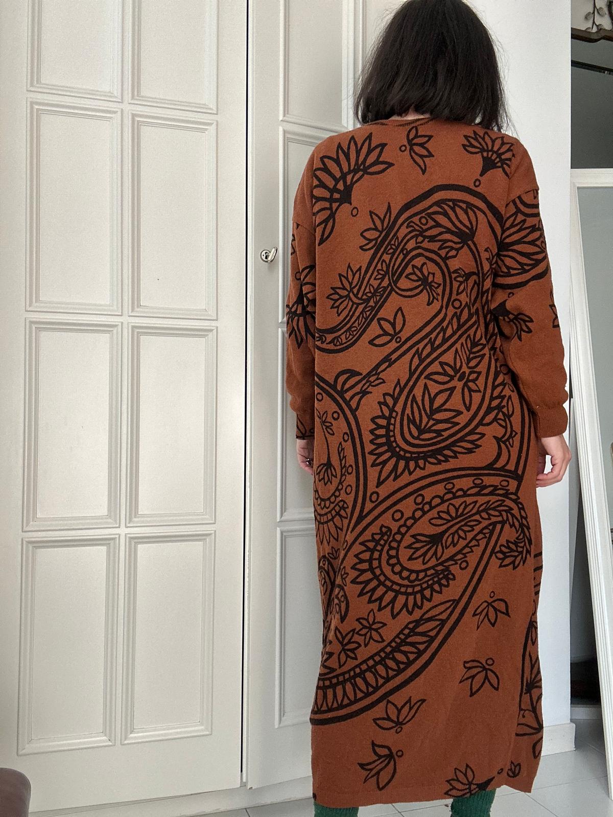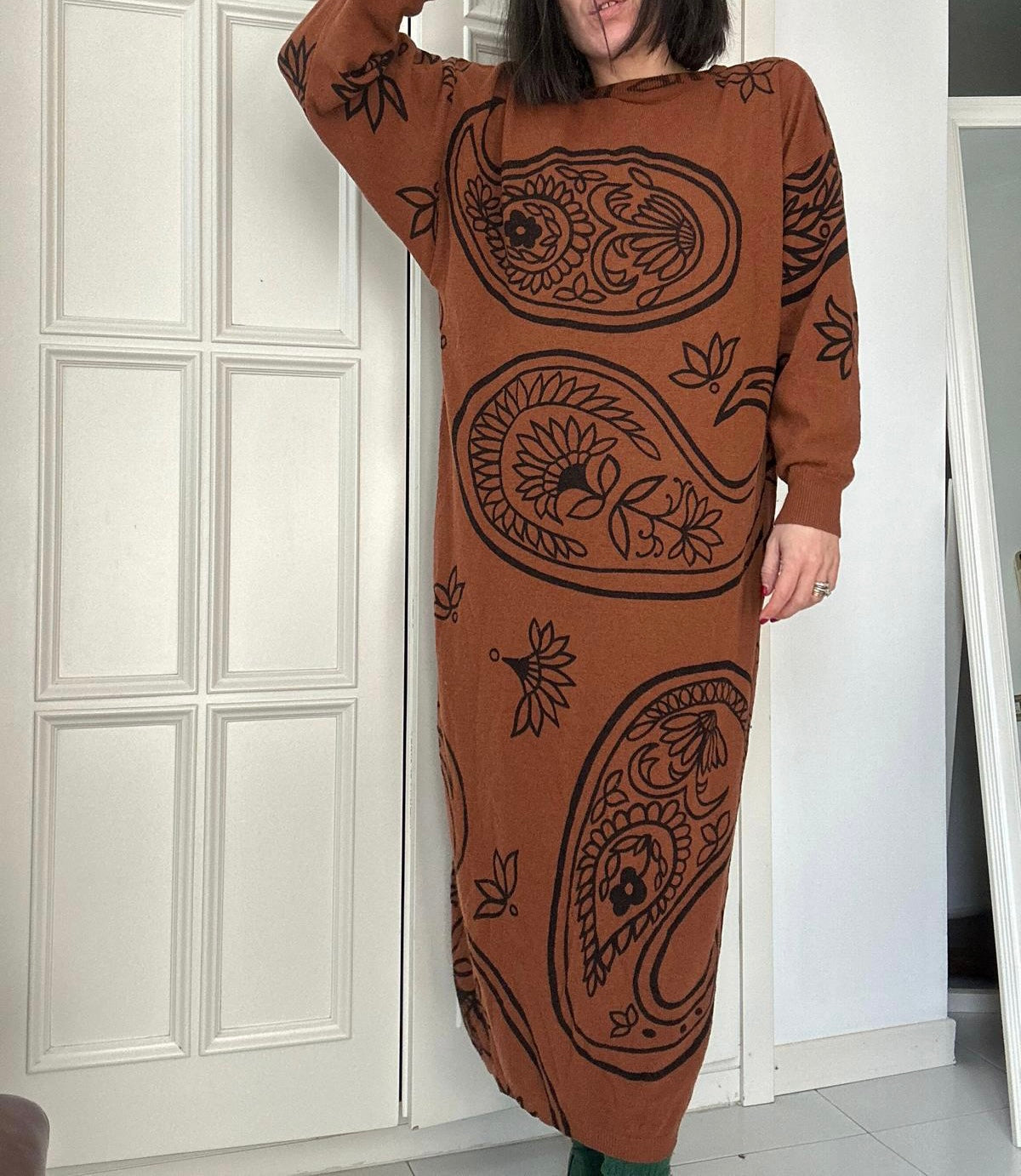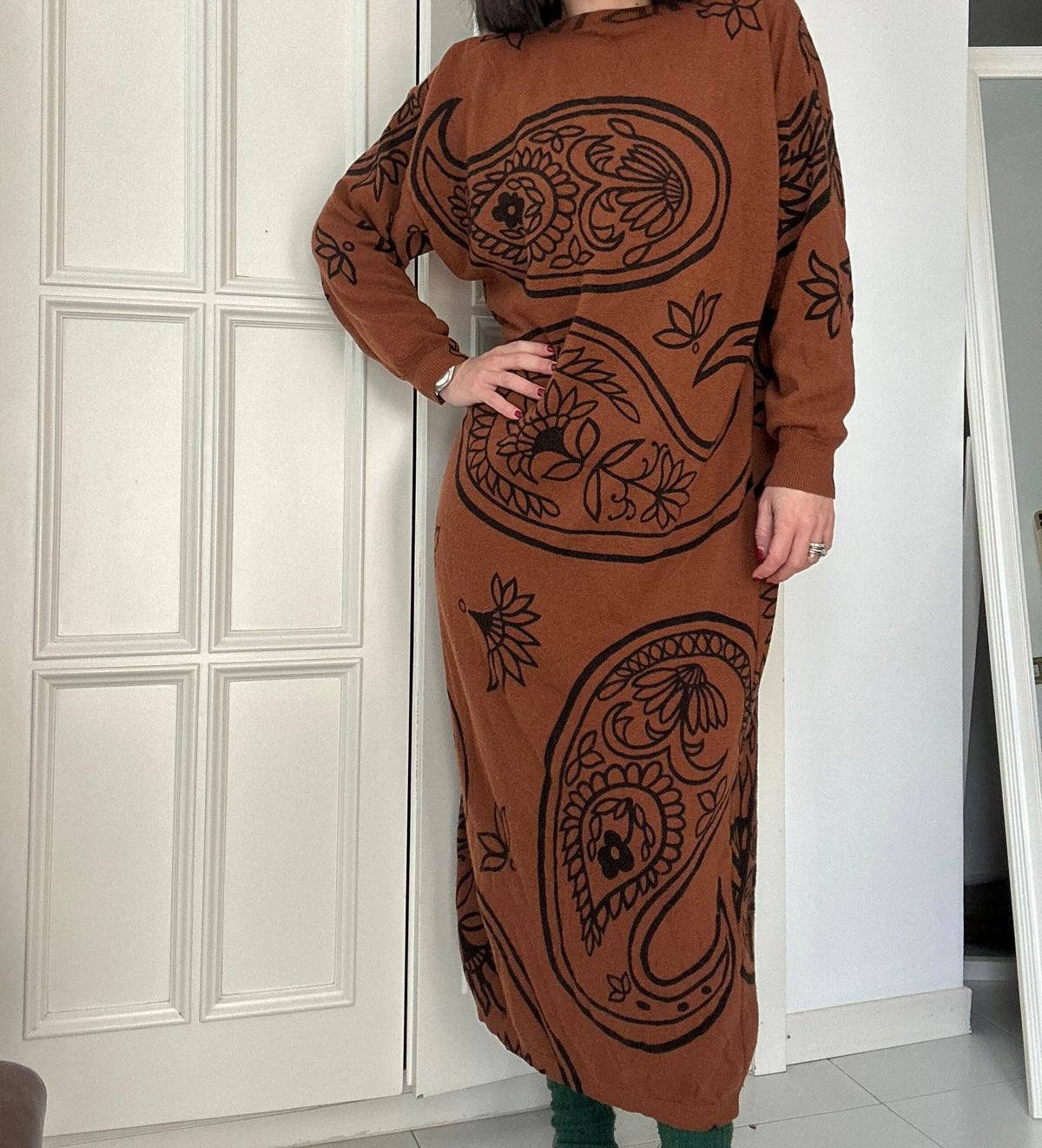 Abito vintage lungo modello color ruggine in pura lana con stampa maxi bandana