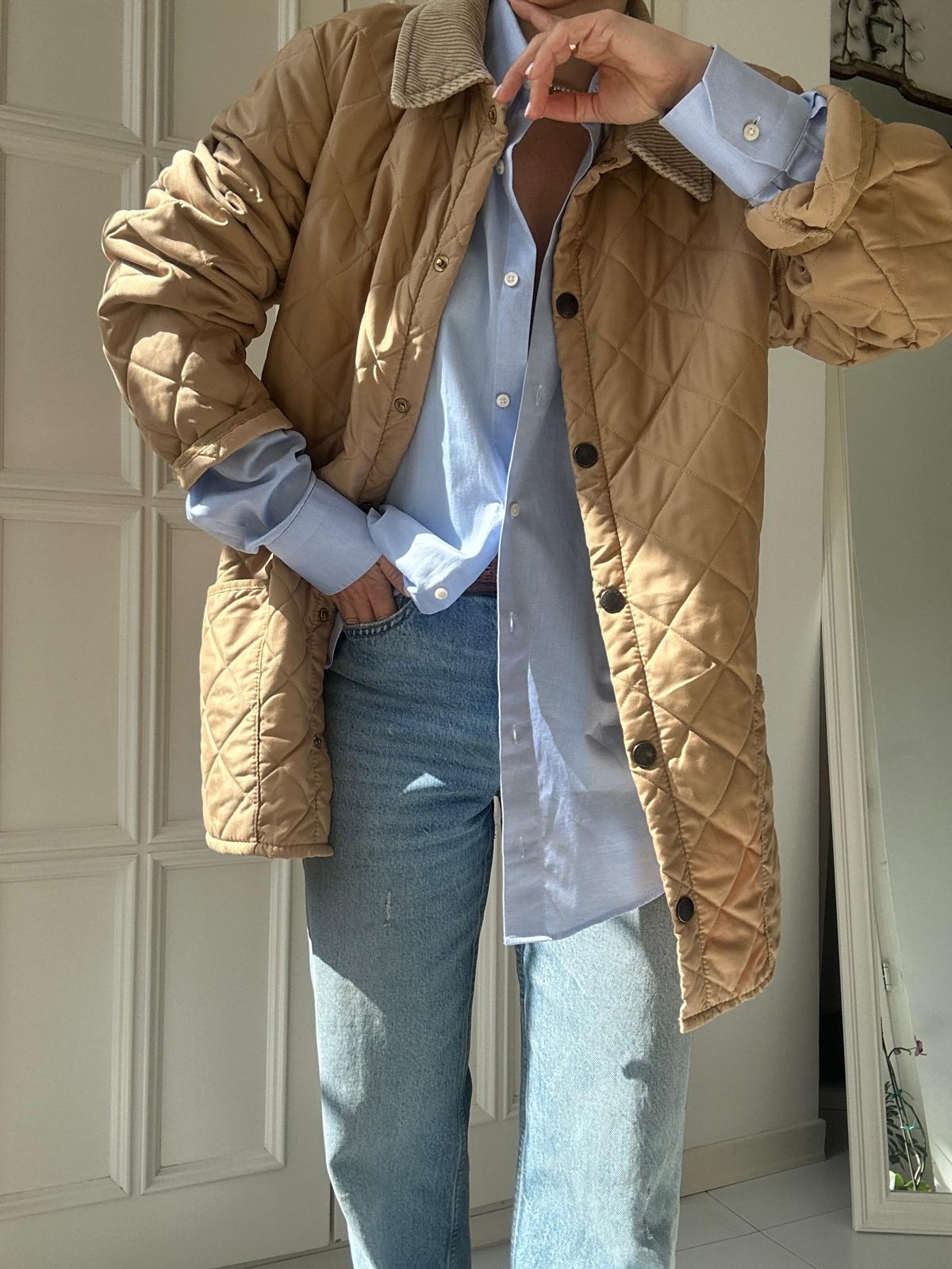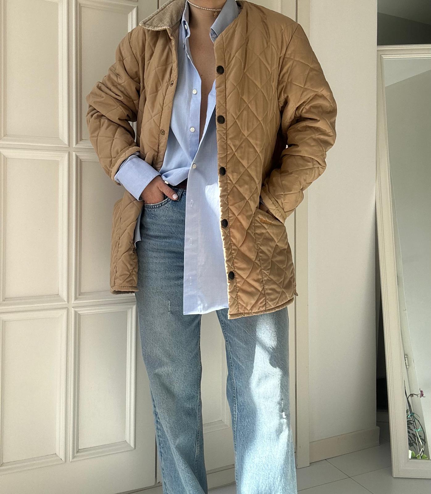 Giacca vintage Barbour color beige con colletto in velluto tono su tono