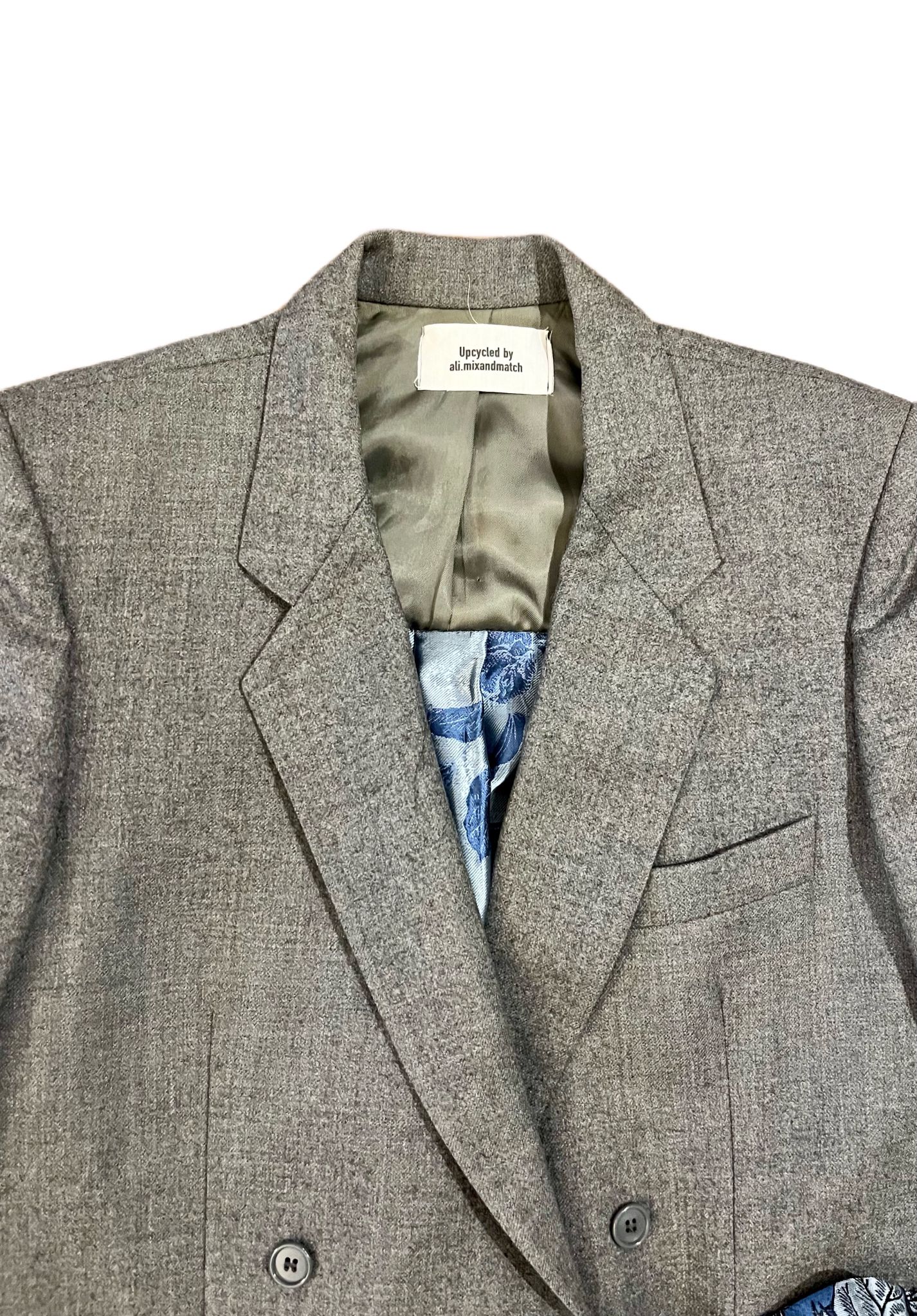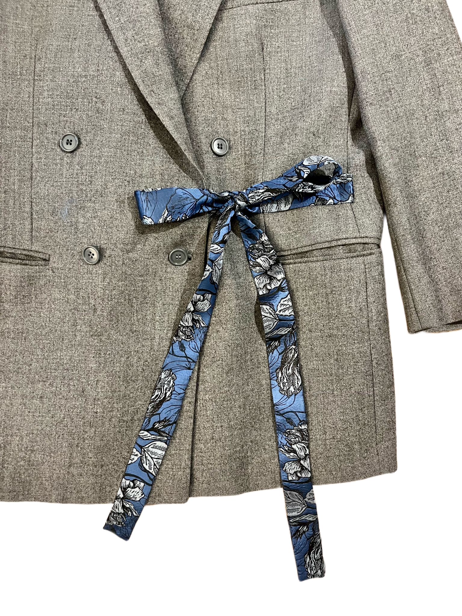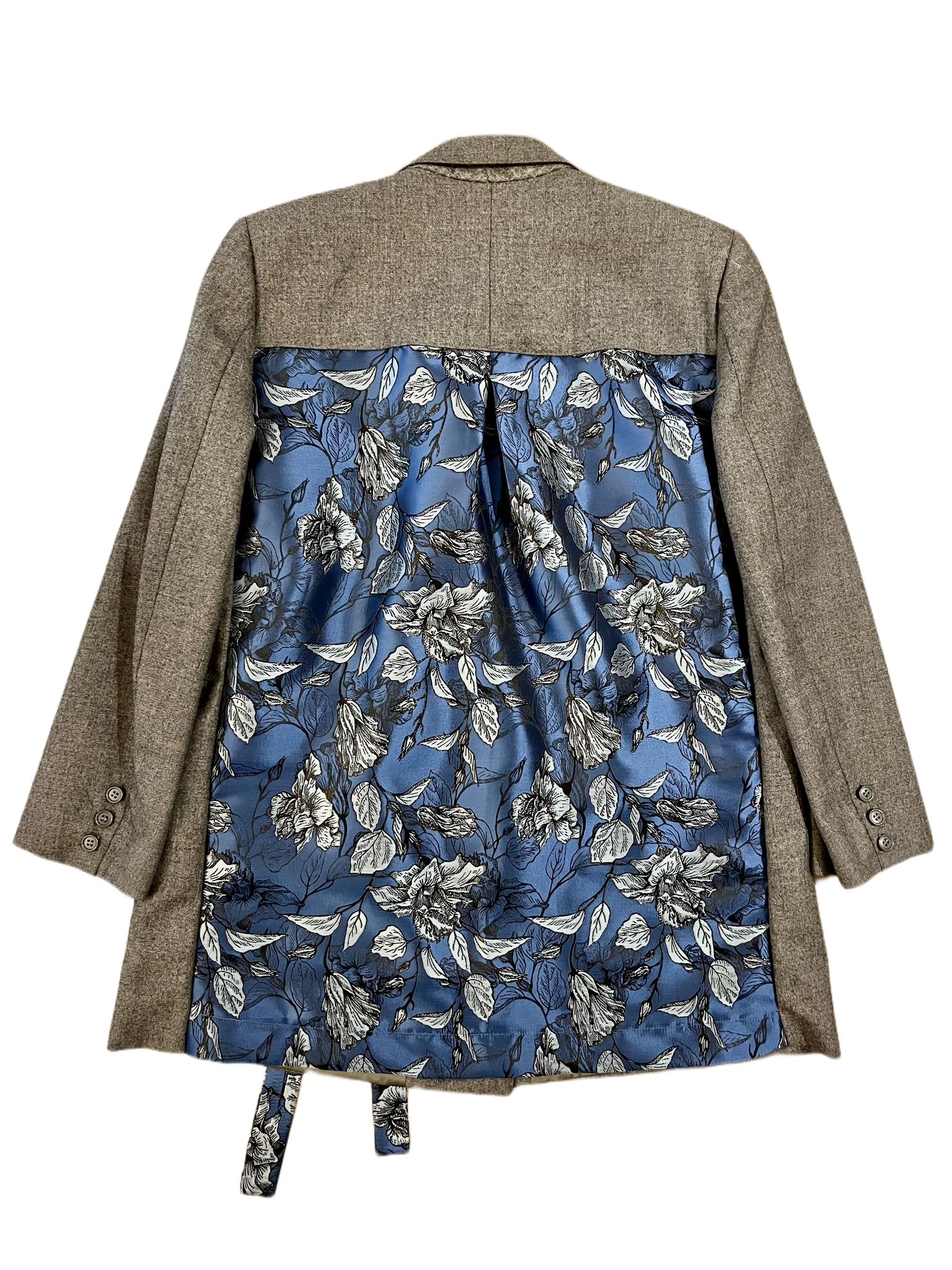 La schiena a presentava delle piccole macchie, per questo è stata sostituita con un tessuto jacquard sui toni del blu e dell’argento.è stata aggiunta anche la possibilità di chiudere la giacca con un fiocchetto dello stesso tessuto.