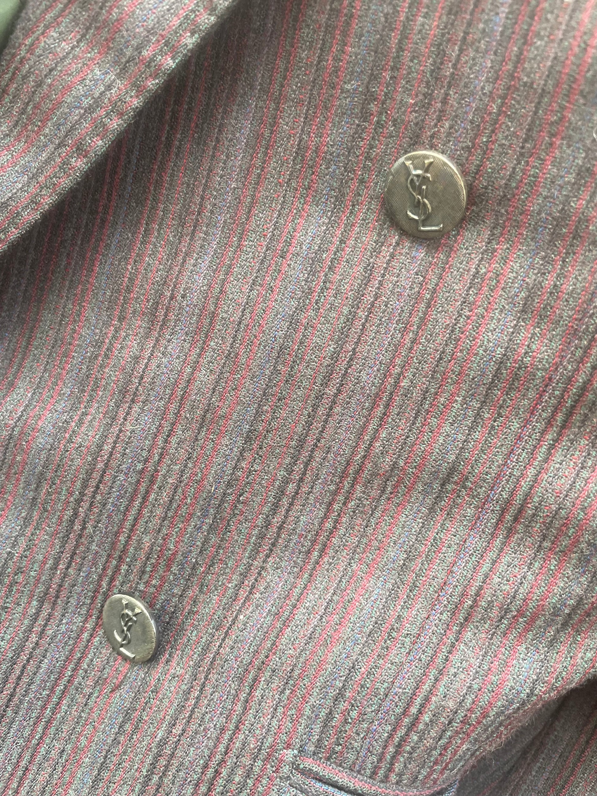 Blazer vintage Yves Saint Laurent in pura lana vergine sui toni del bordeaux e del grigio, forma strutturata e doppio petto
