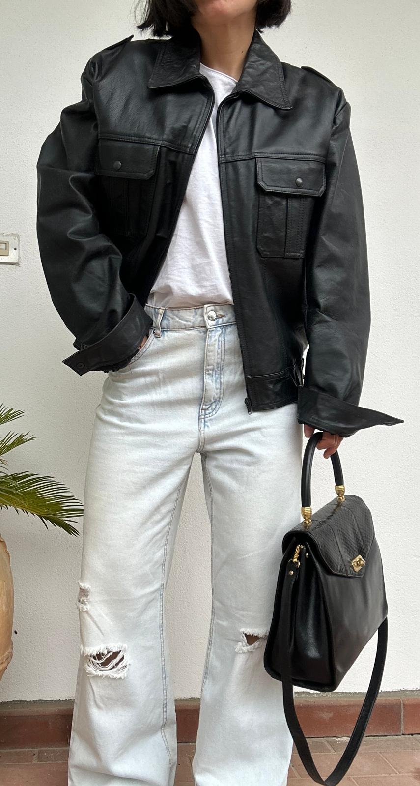 Bomber vintage in vera pelle color nero interno leggermente imbottito