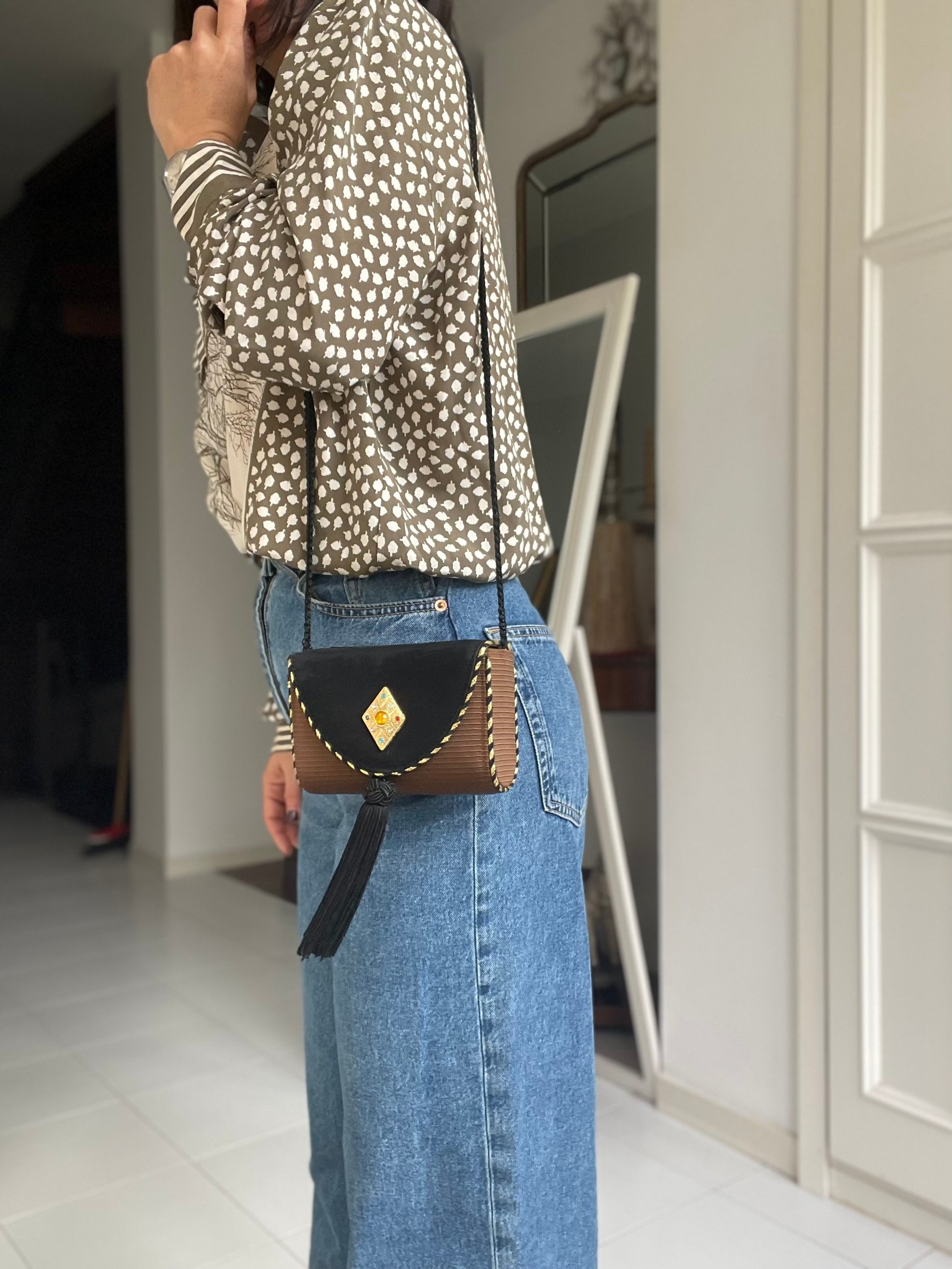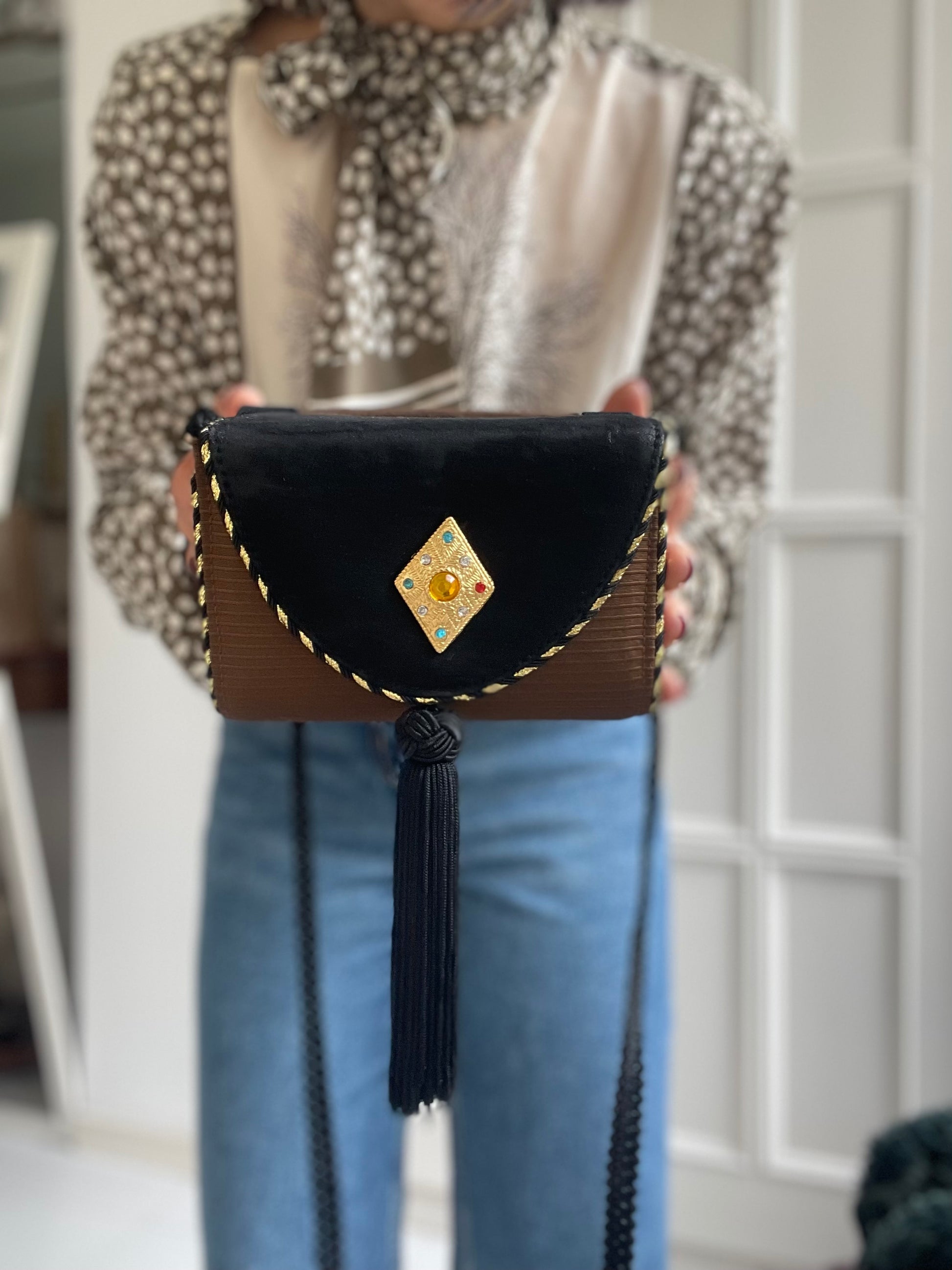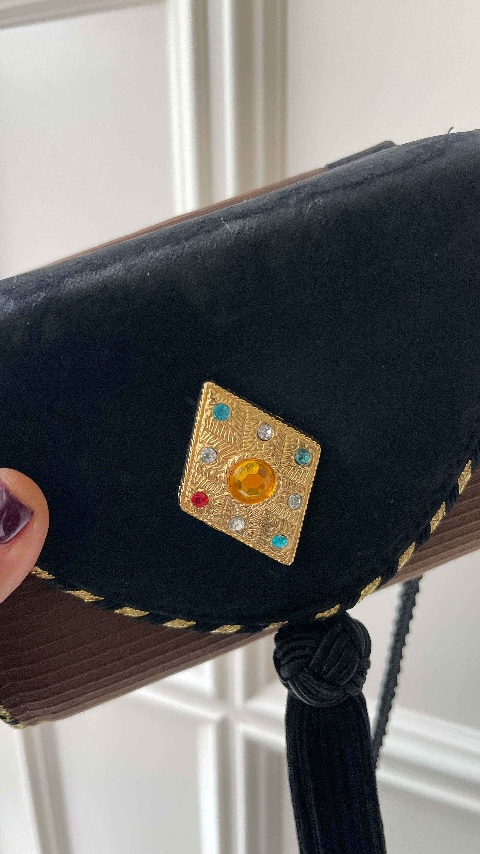 Borsa da sera in velluto vintage primi anni ‘80modello a spalla,colore nero con impunture a contrasto oro e marrone