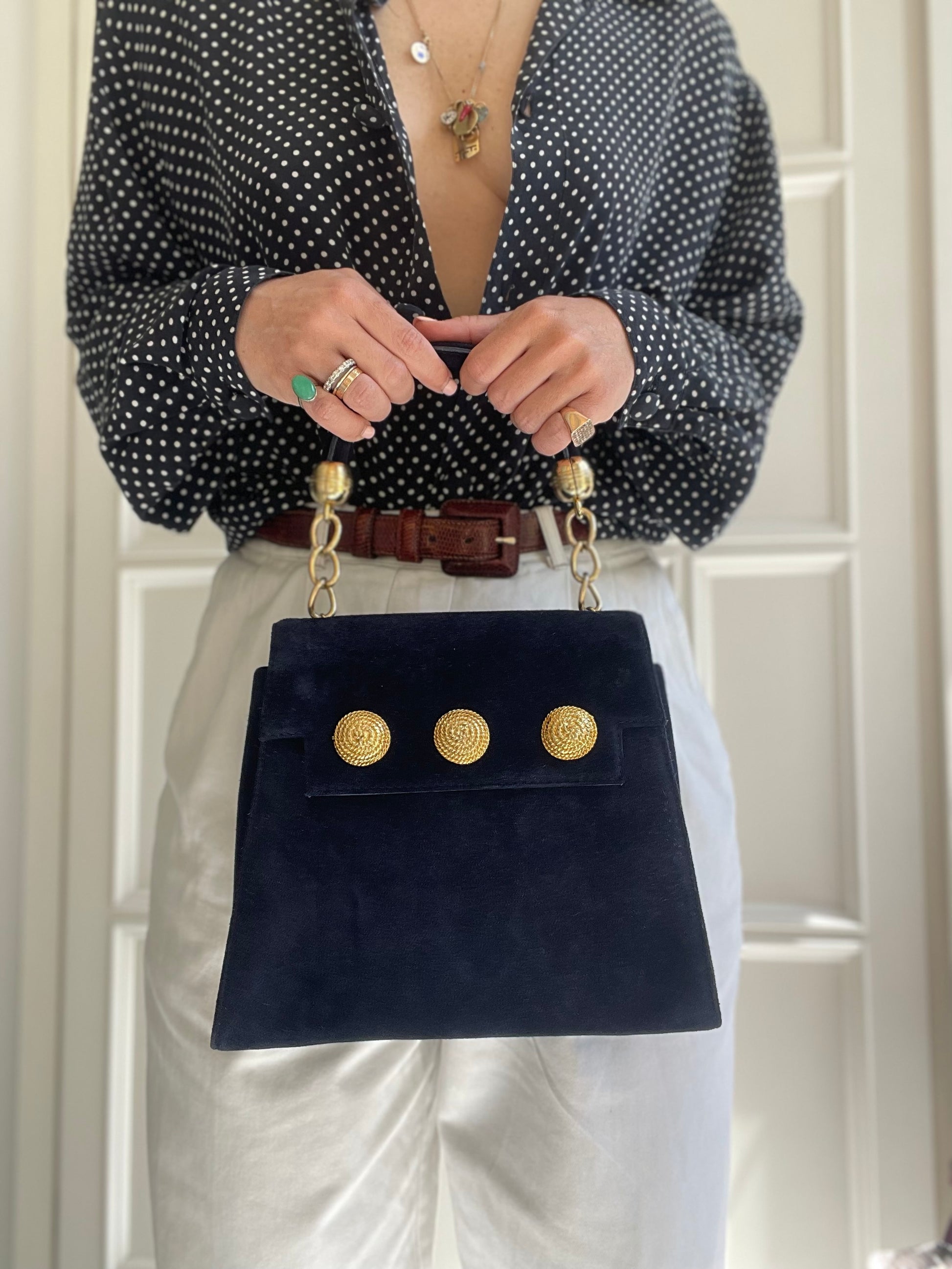 Borsa vintage in vera pelle suede in colore blu con applicazioni oro.