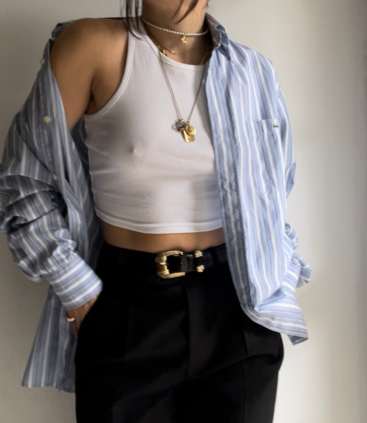 Camicia Lacoste vintage a righe (colori celeste, bianco, blu e grigio). Nasce come capo da uomo.