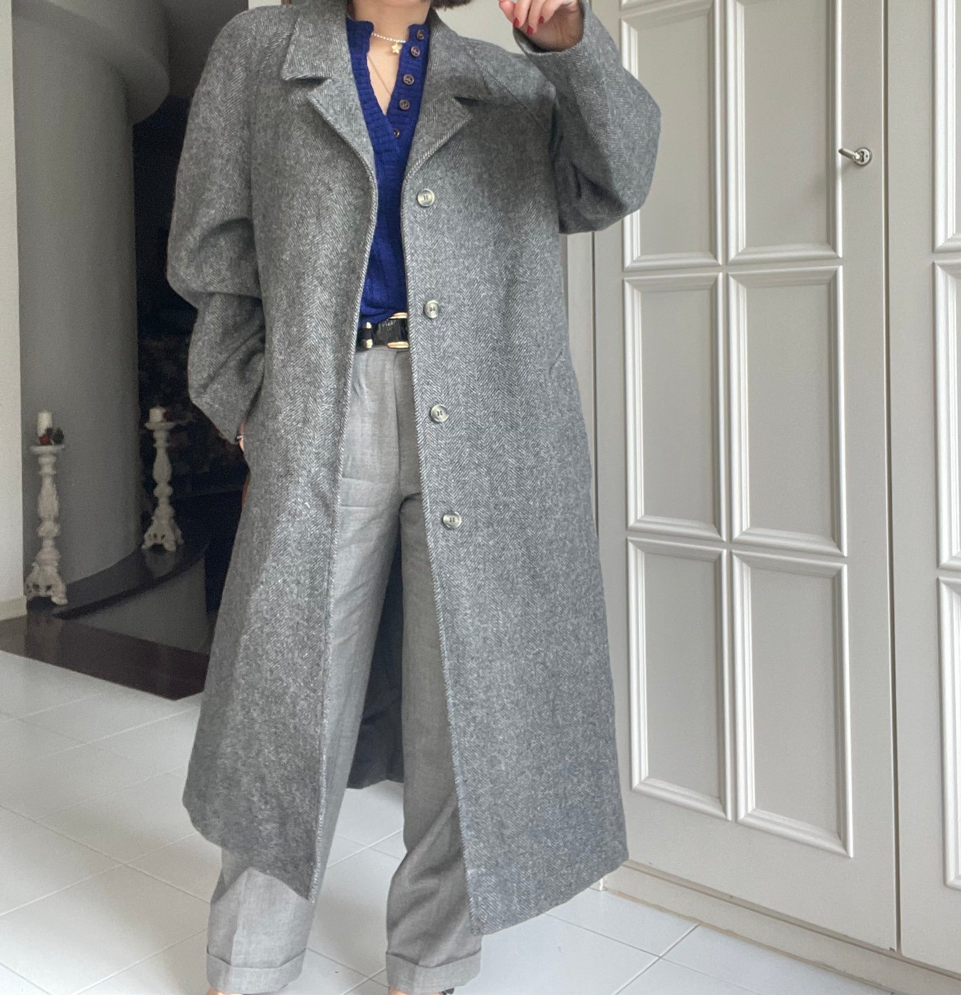 Cappotto vintage grigio spigato in lana e mohair pazzesco….
