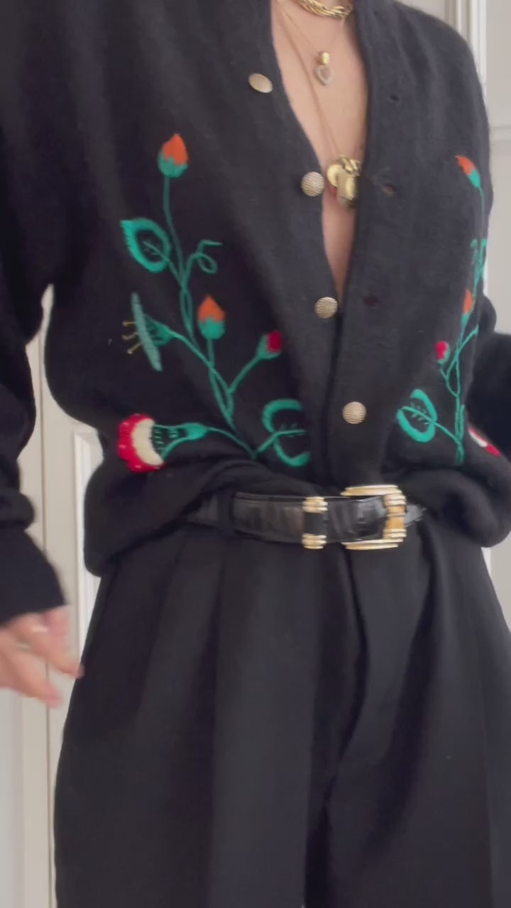 Cardigan vintage in pura lana vergine color nero, con ricami eseguiti a mano.