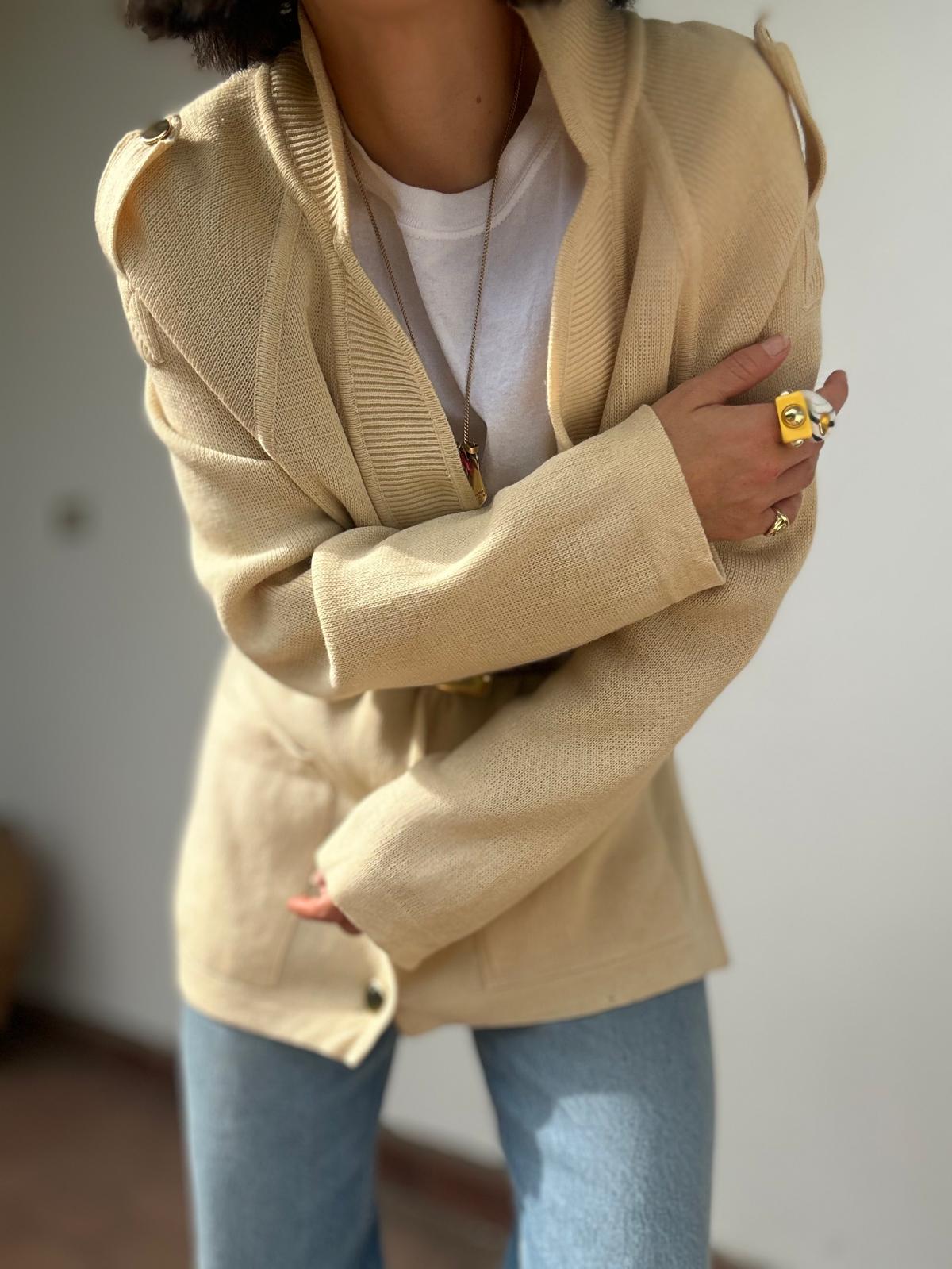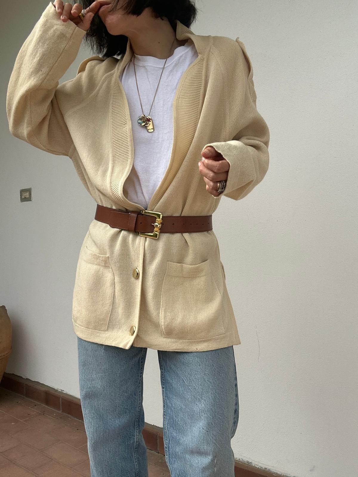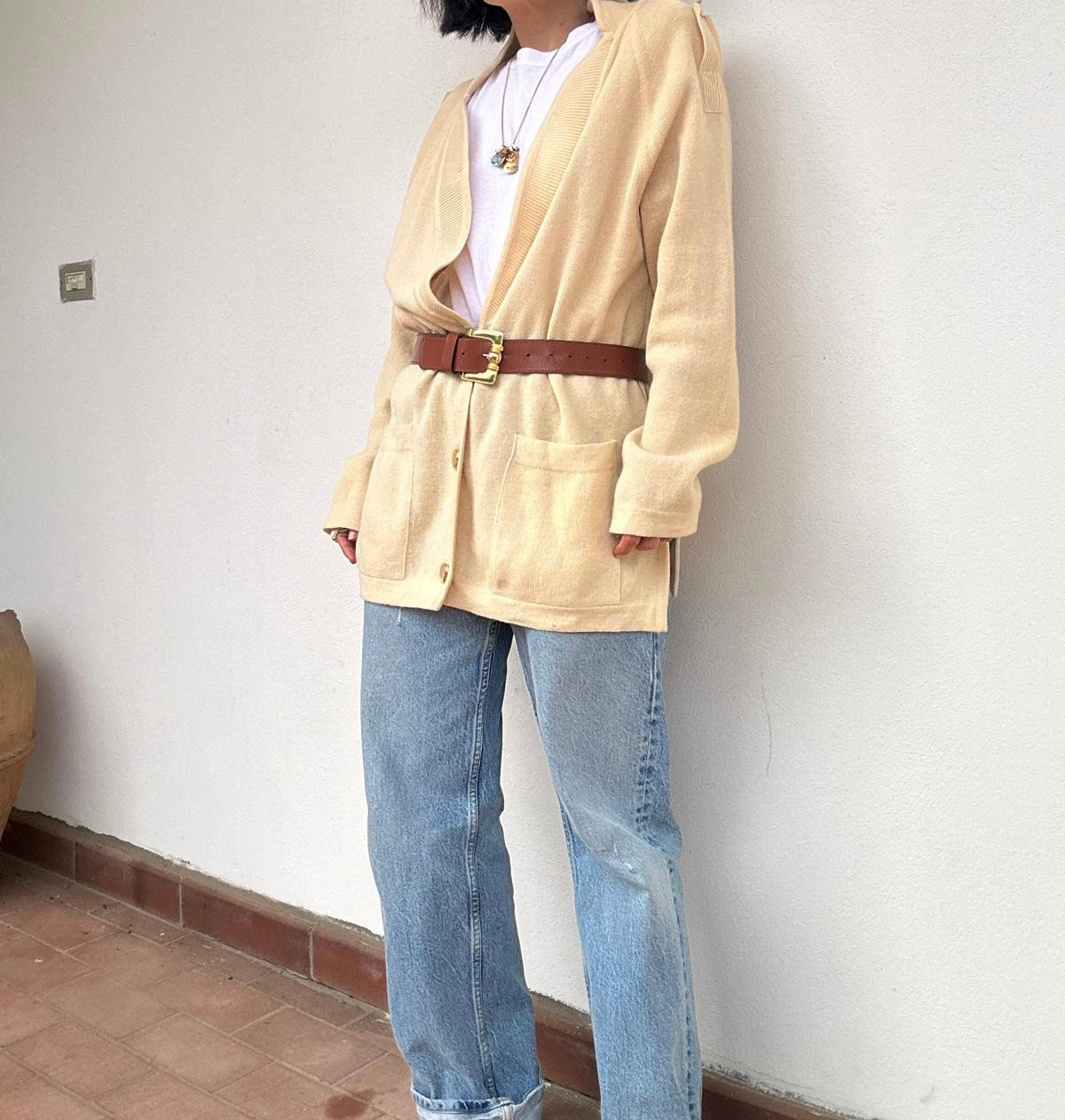 Cardigan vintage in pura lana vergine colore panna con bottoni oro