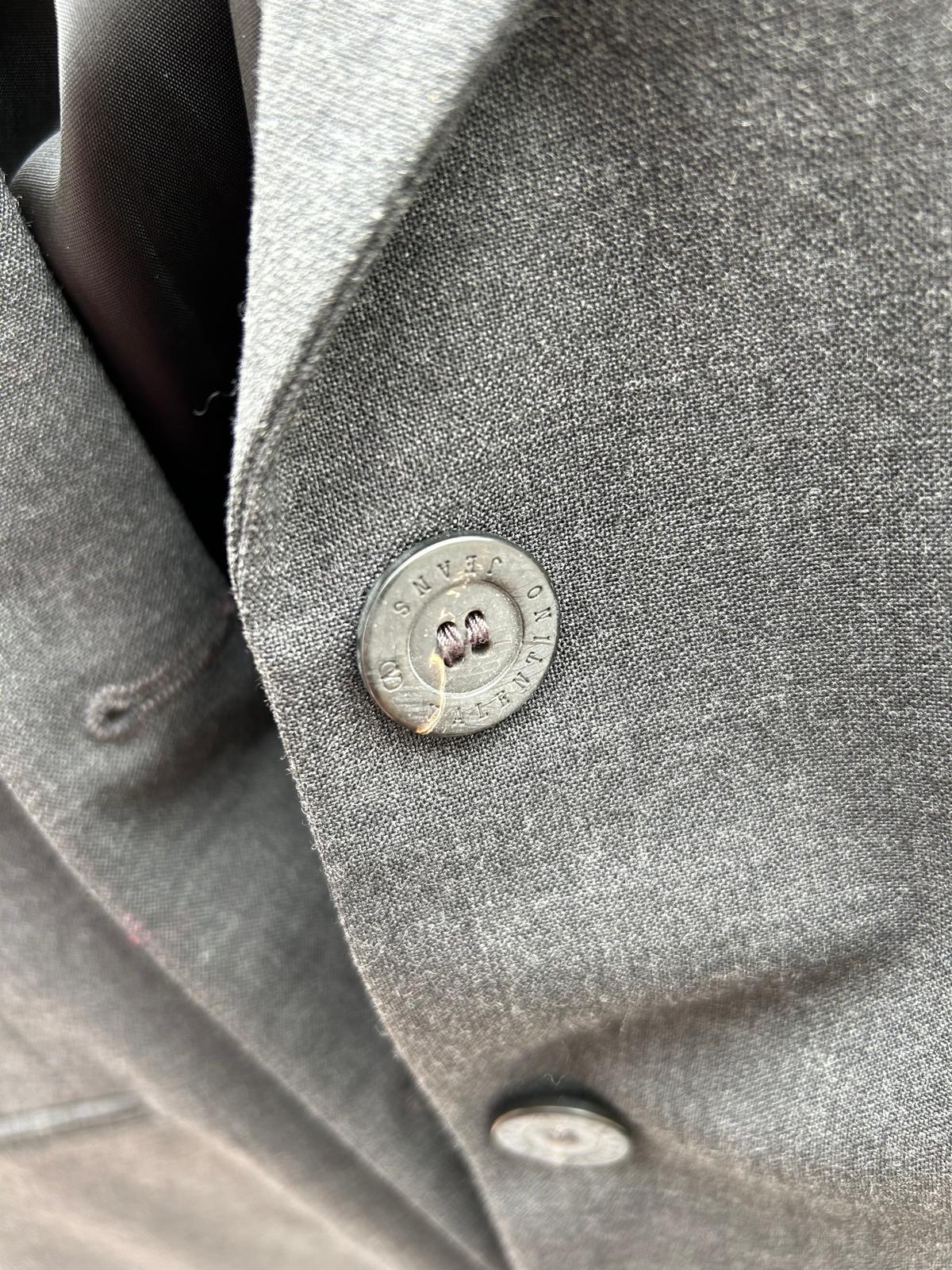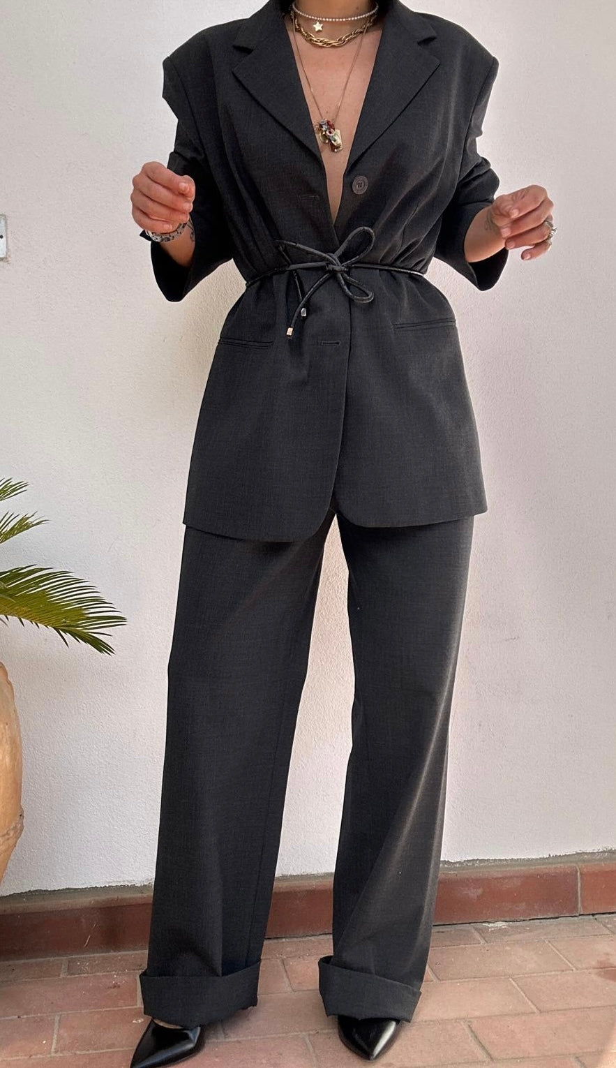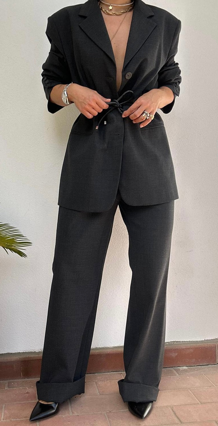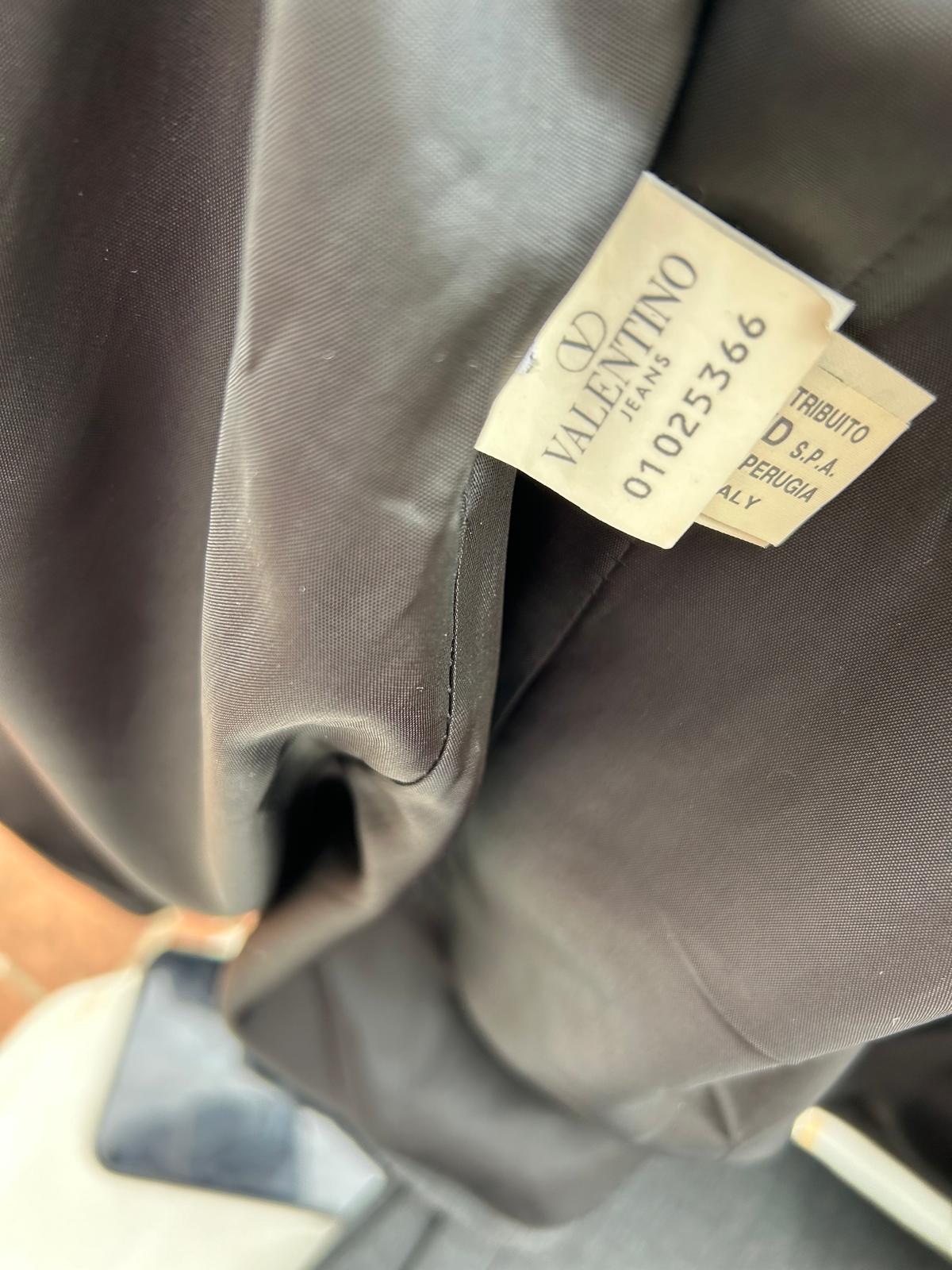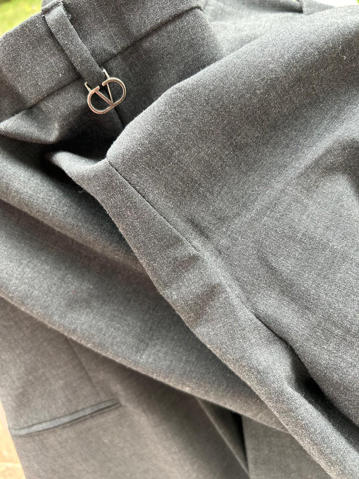 Completo vintage in lana color grigio Valentino..Composto da blazer e pantalone. Logo in acciaio sul retro del pantalone