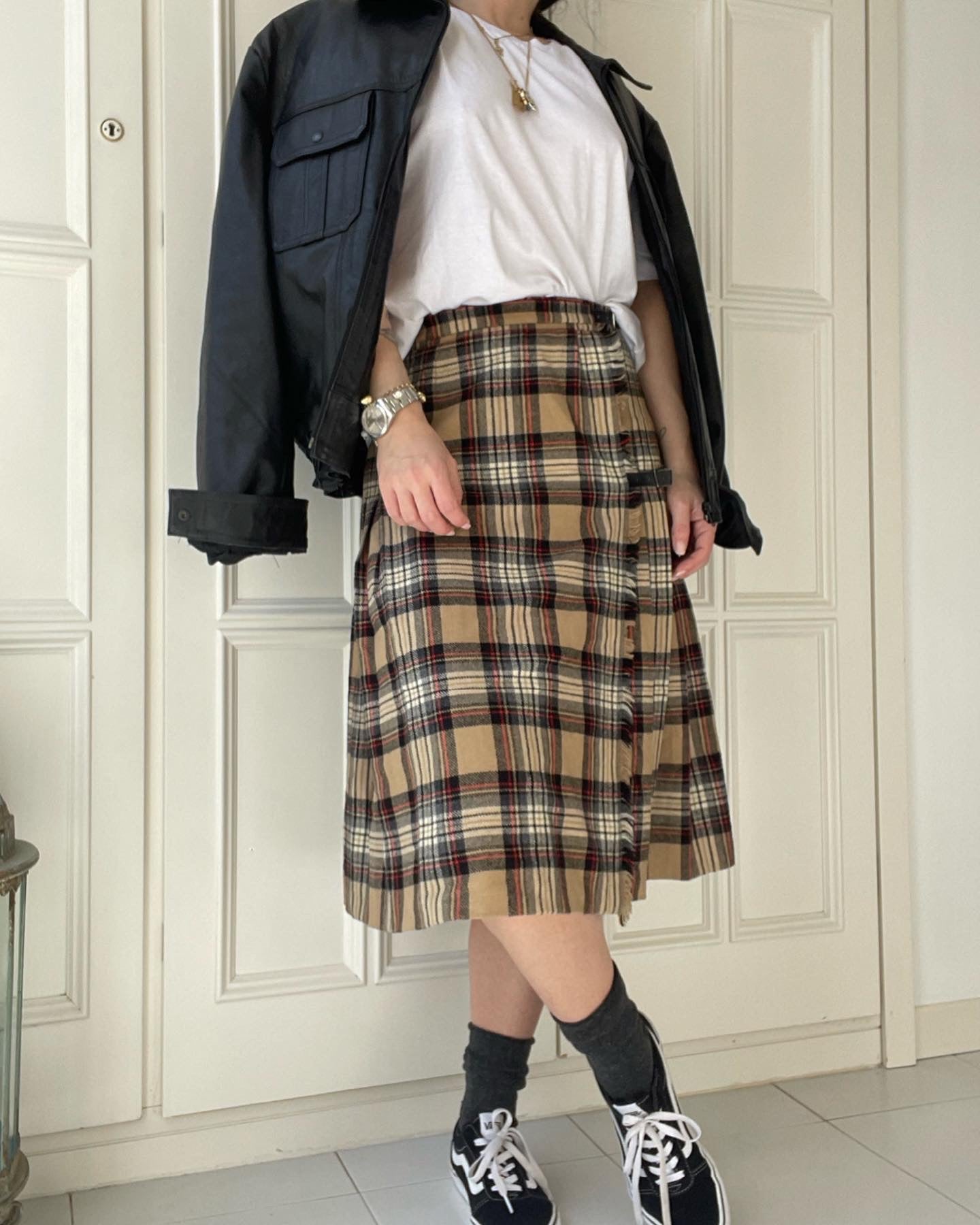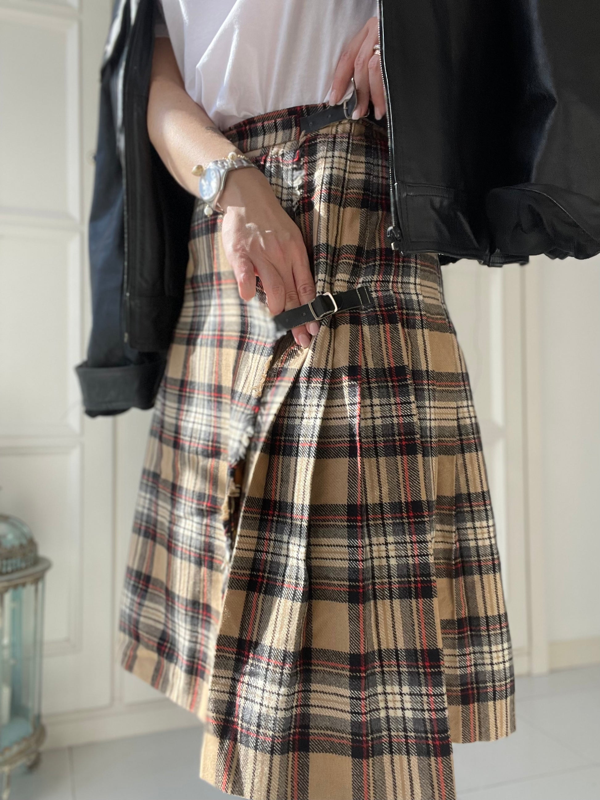 Gonna vintage sartoriale in pura lana tartan sui toni del beige