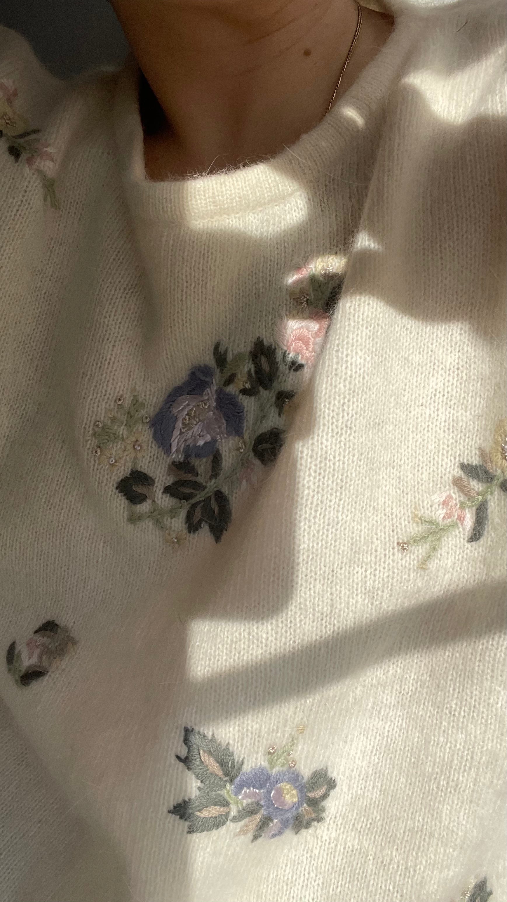 Maglione soffice in misto lana di agnello e angora color bianco con ricami