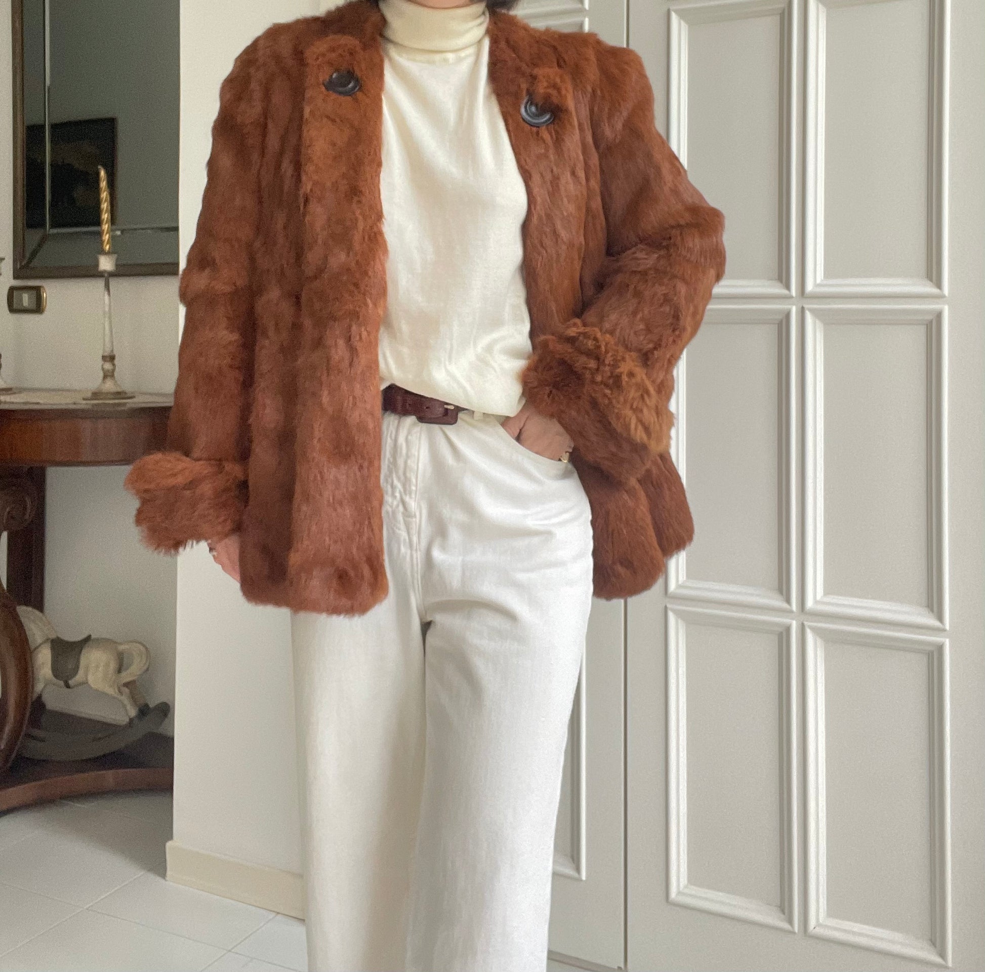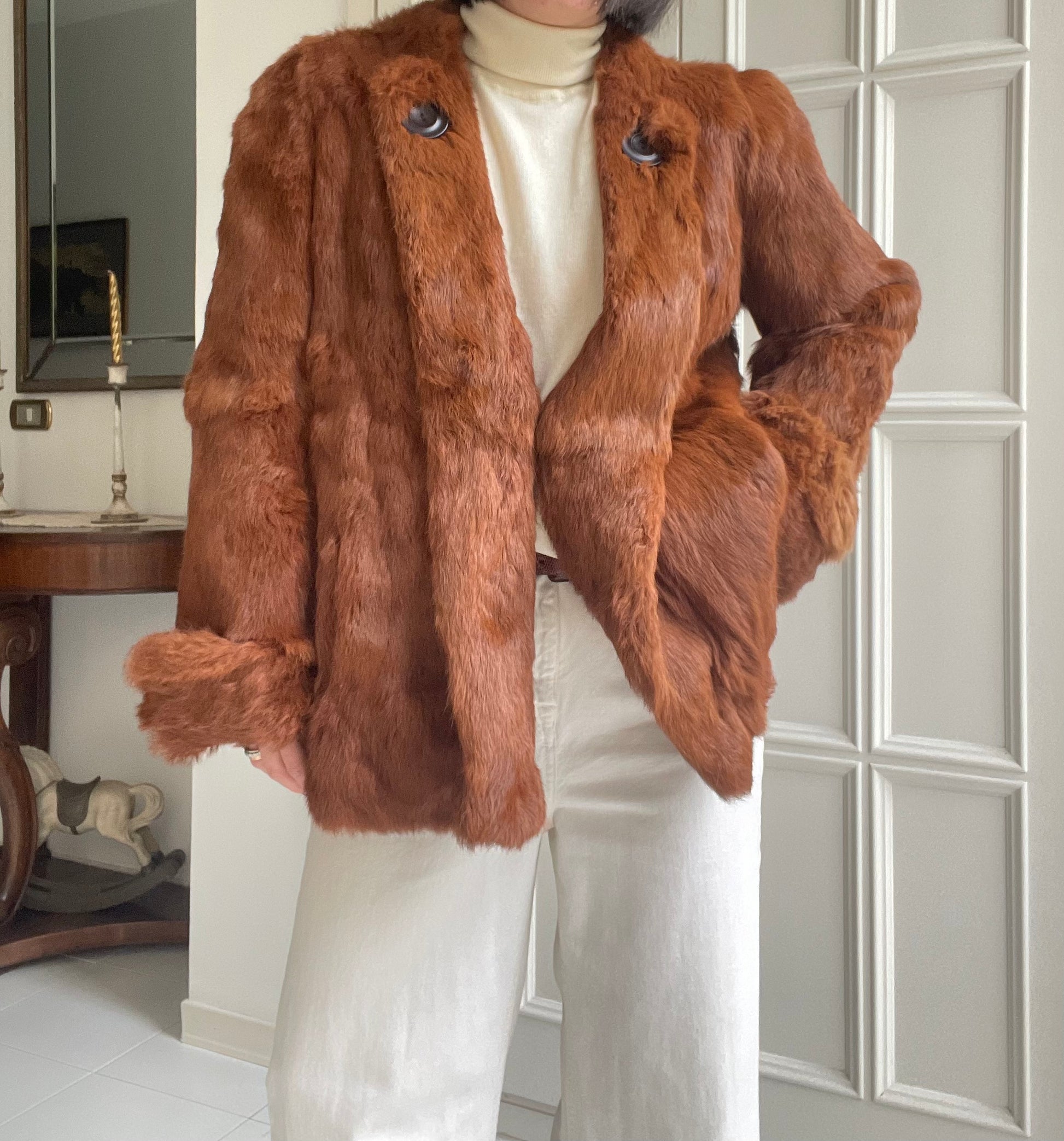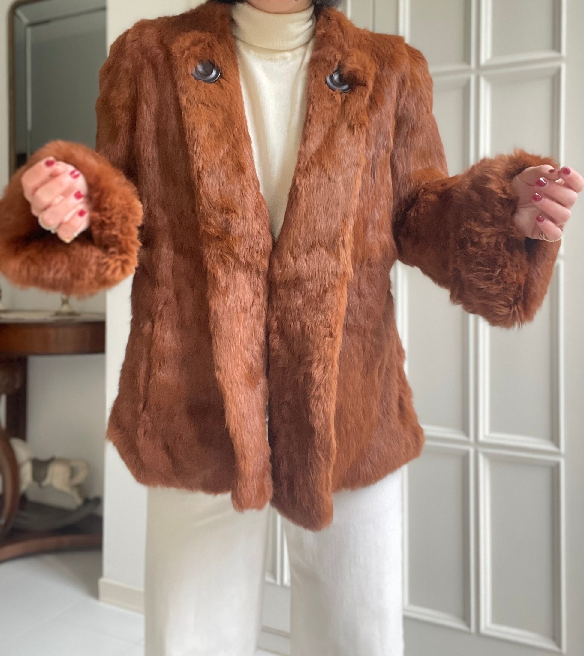 Pelliccia in vero lapin nei toni del cognac con manica a campana
