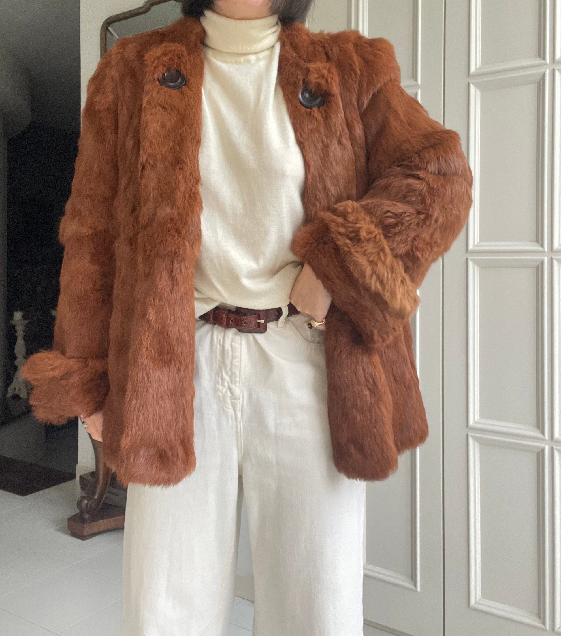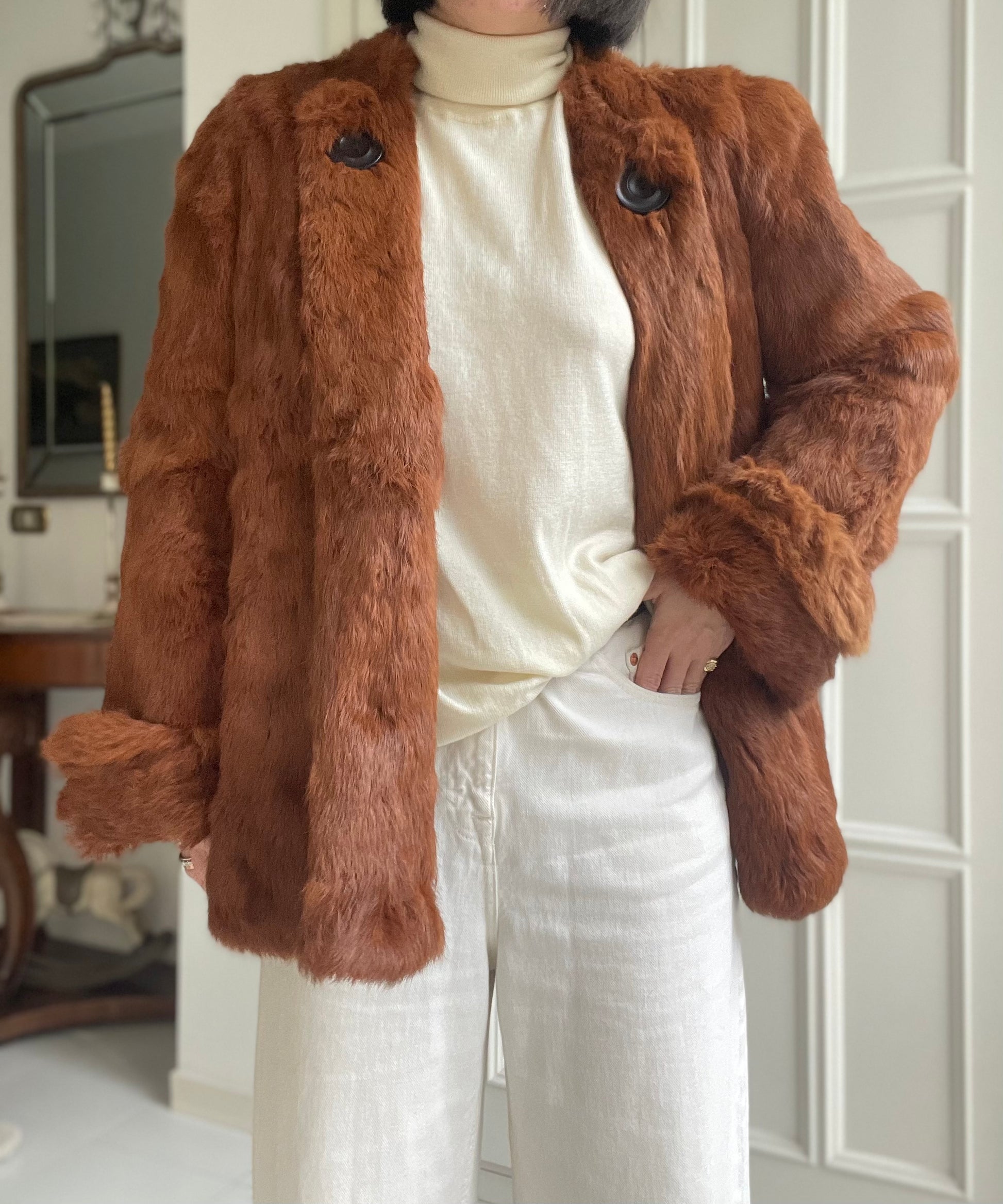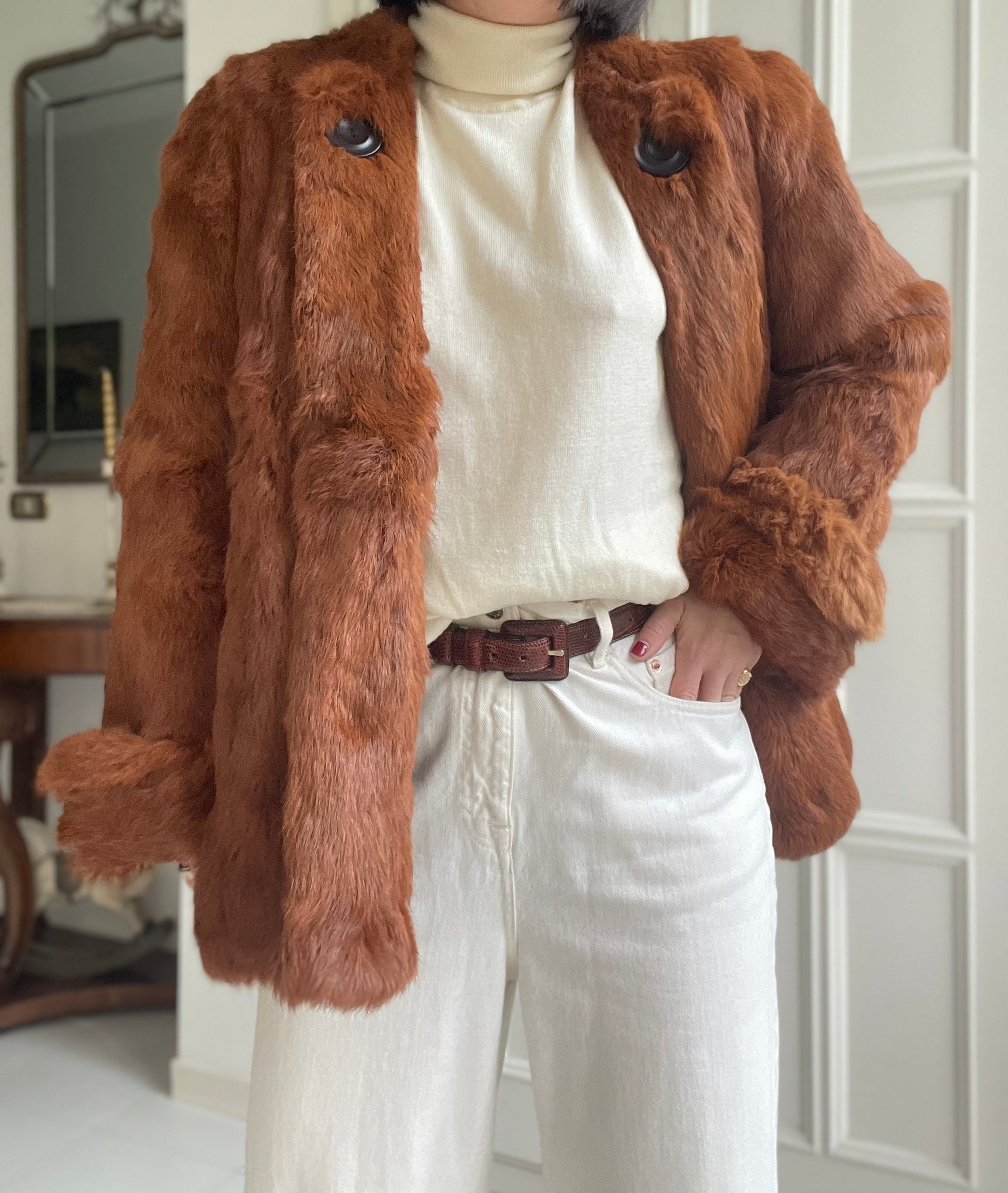 Pelliccia in vero lapin nei toni del cognac con manica a campana
