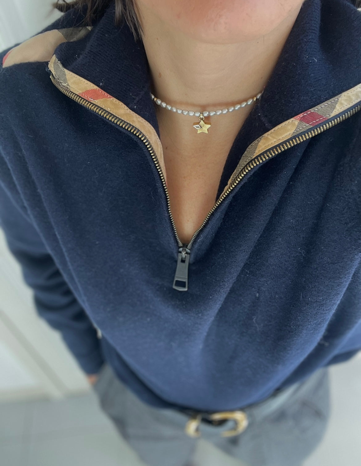 Maglione vintage Burberry con collo a polo in 100 lana color blu con dettagli su collo e spalle in nova check,dettaglio sul fondo ricamo logo