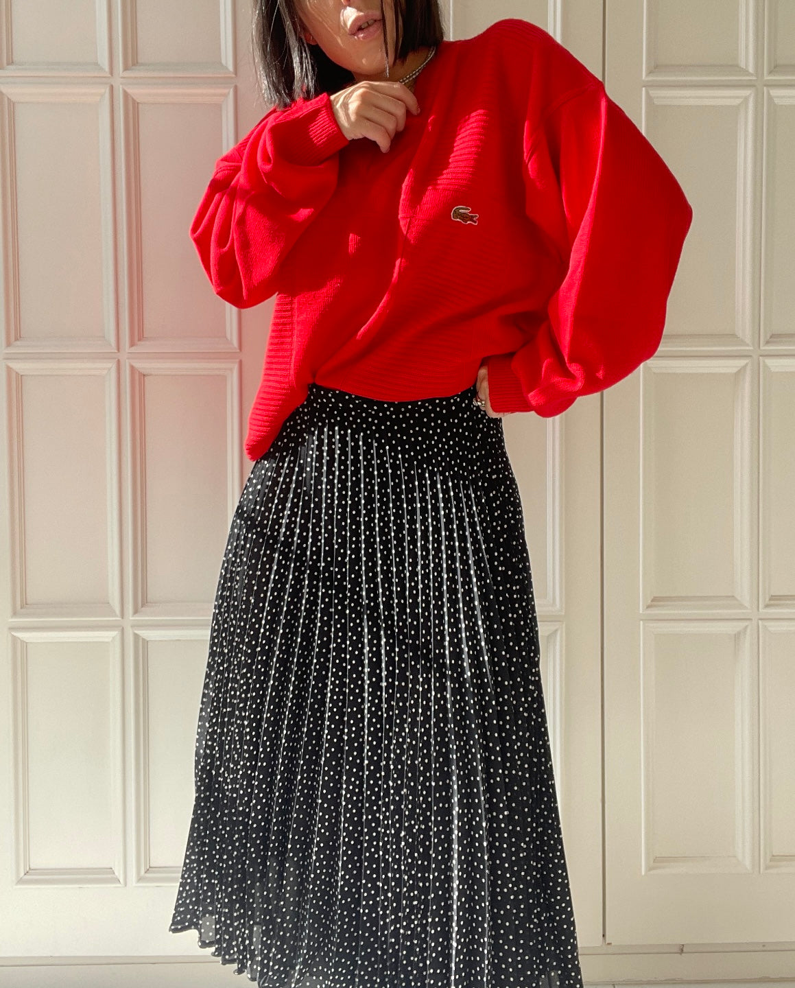 Maglione vintage Lacoste con collo a V in pura lana vergine color rosso