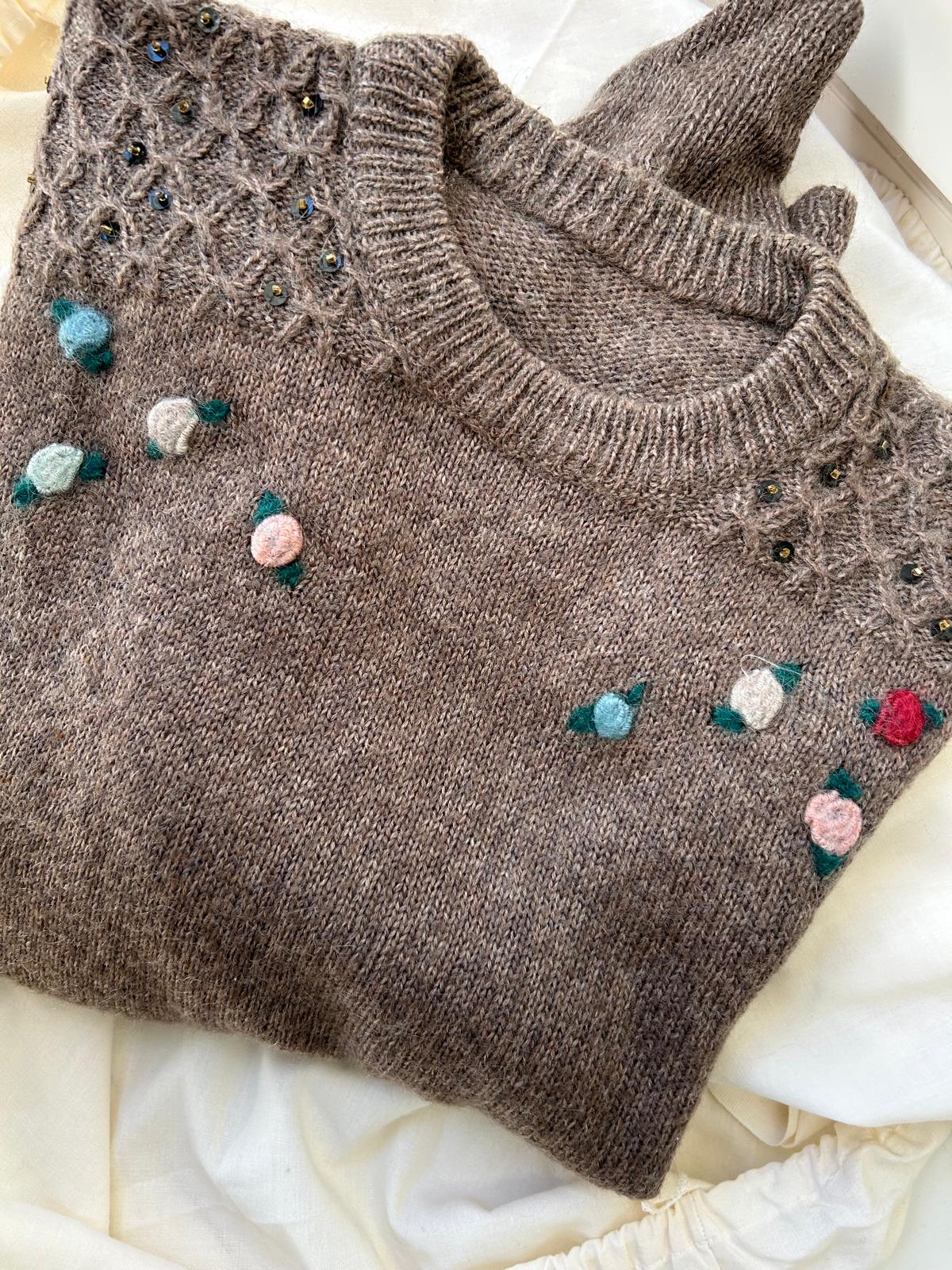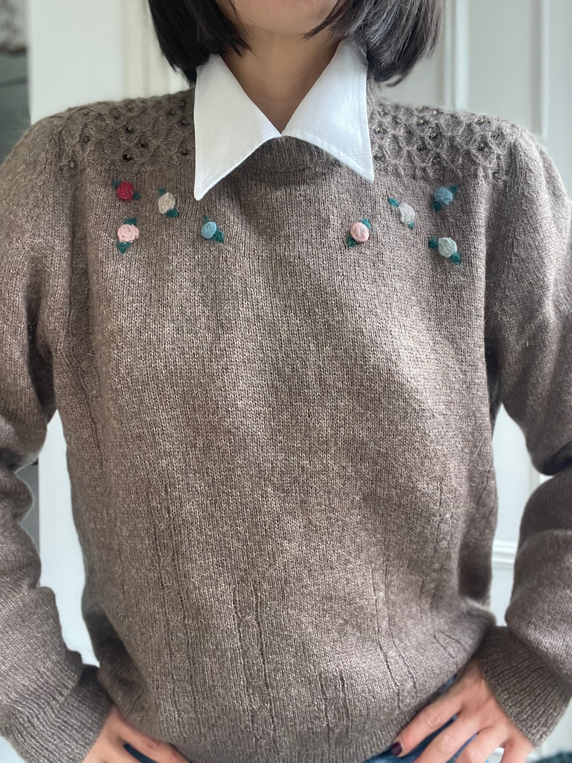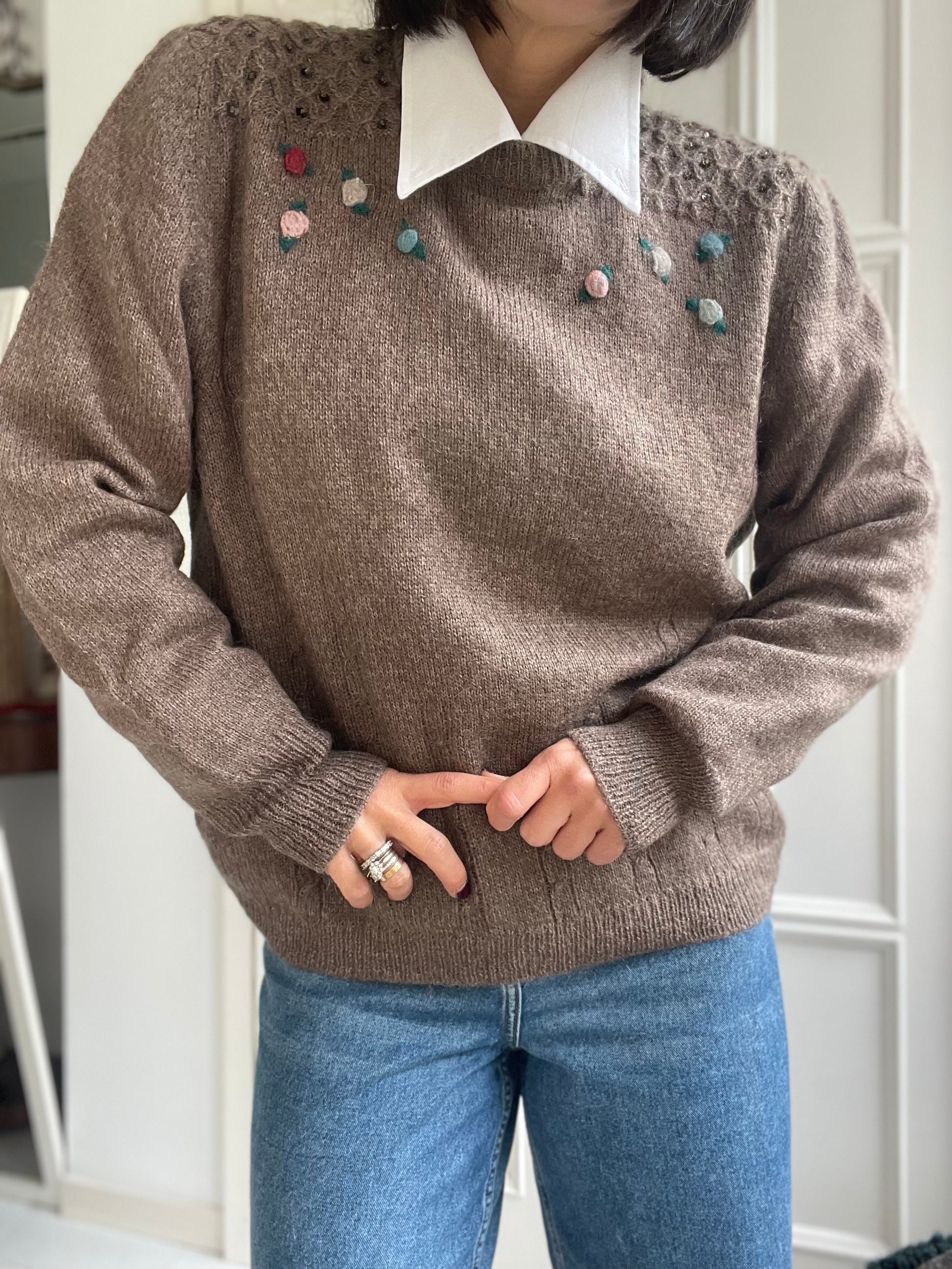 Pullover ricamato in pura lana color cioccolato con ricami di paillettes e roselline colorate