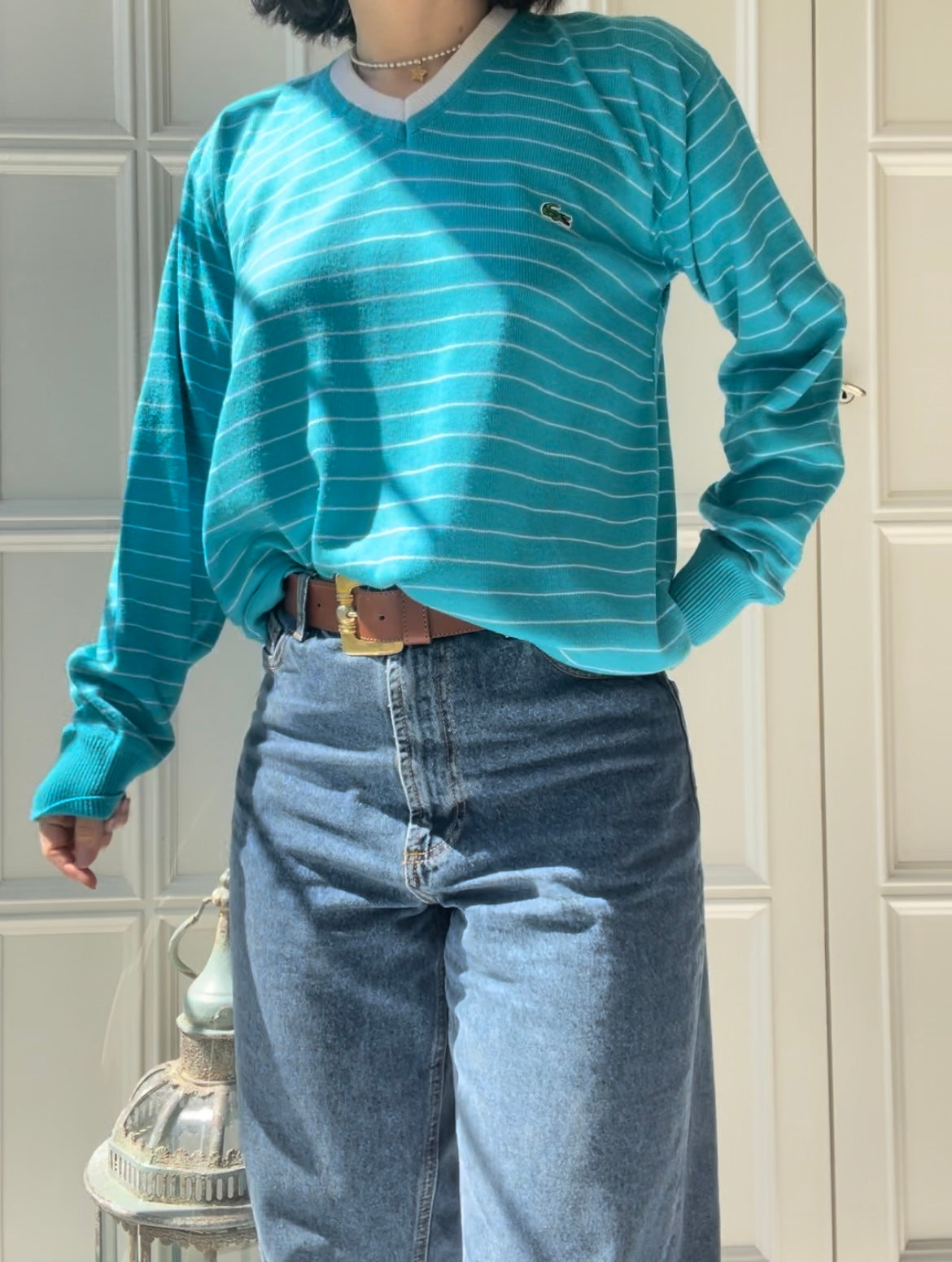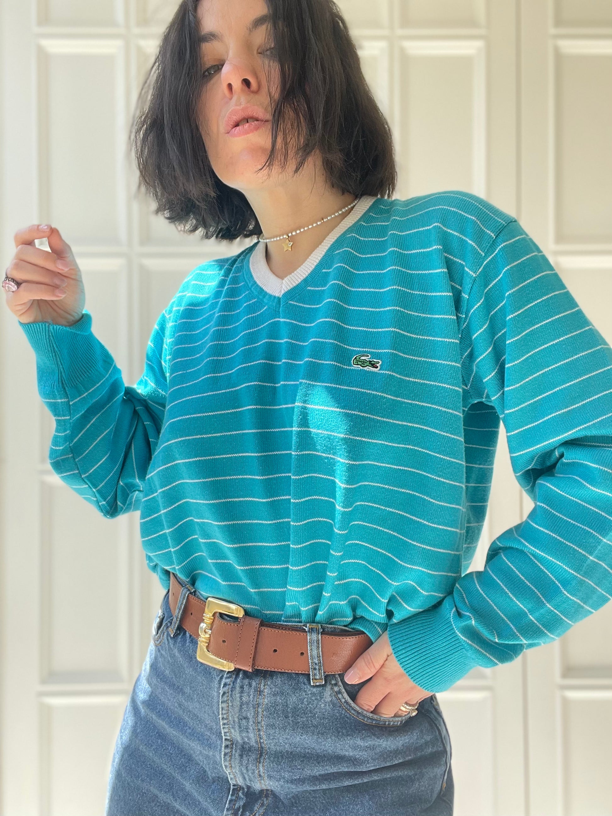 Maglione vintage Lacoste in puro cotone colore azzurro con righe bianche