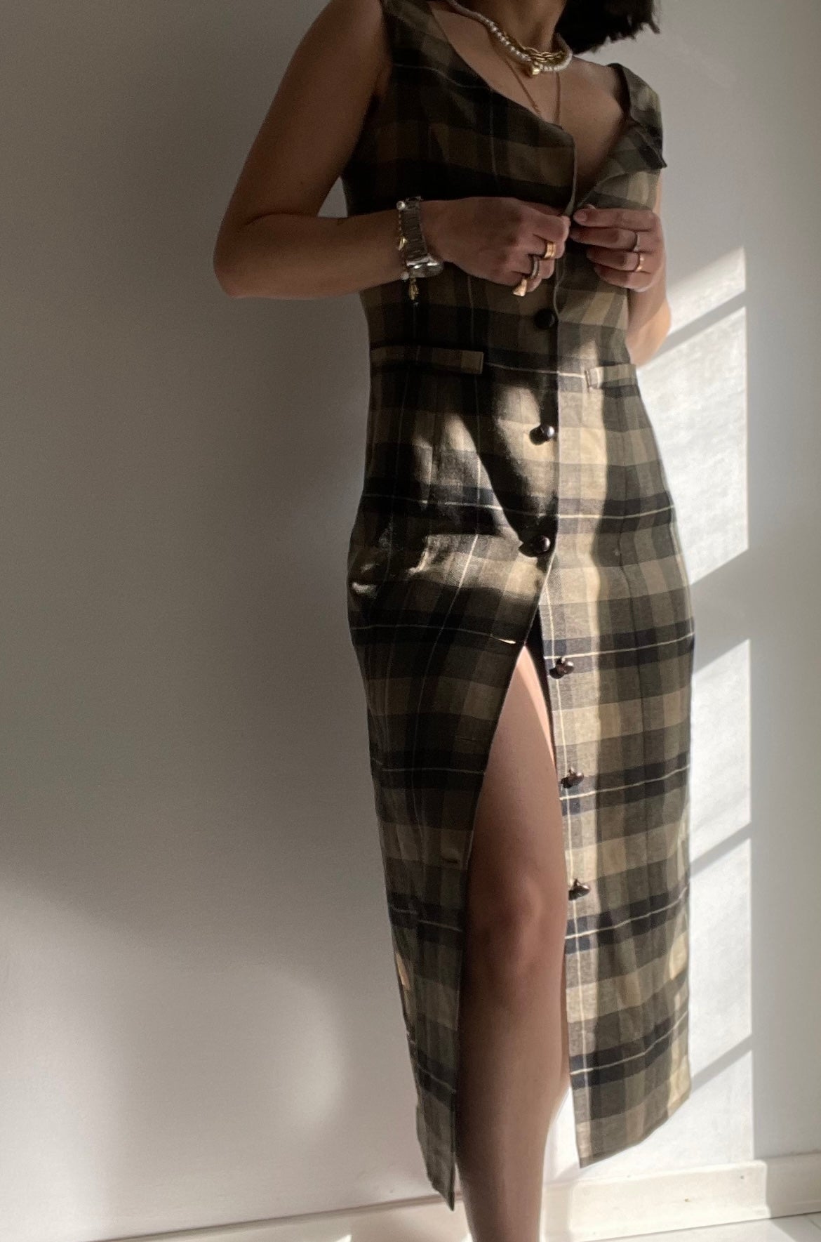 Abito vintage lungo in pura lana color beige e verde