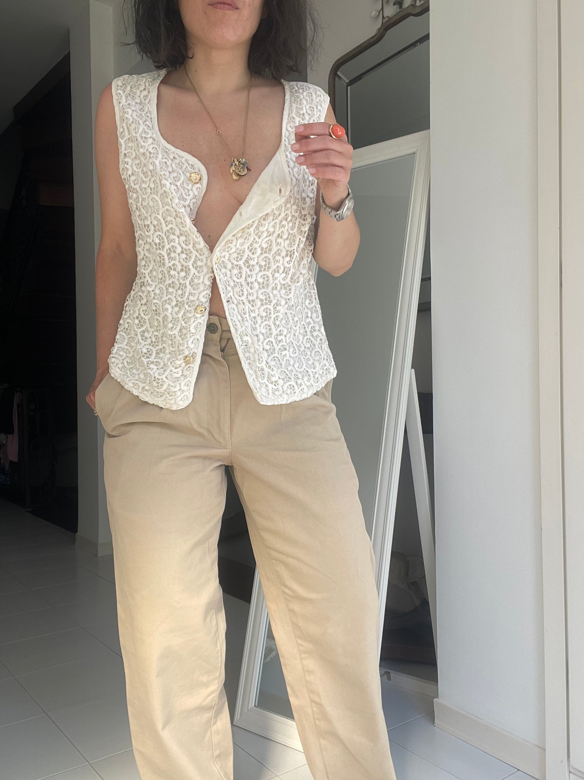Gilet vintage in pizzo in pura viscosa color panna chiaro,f