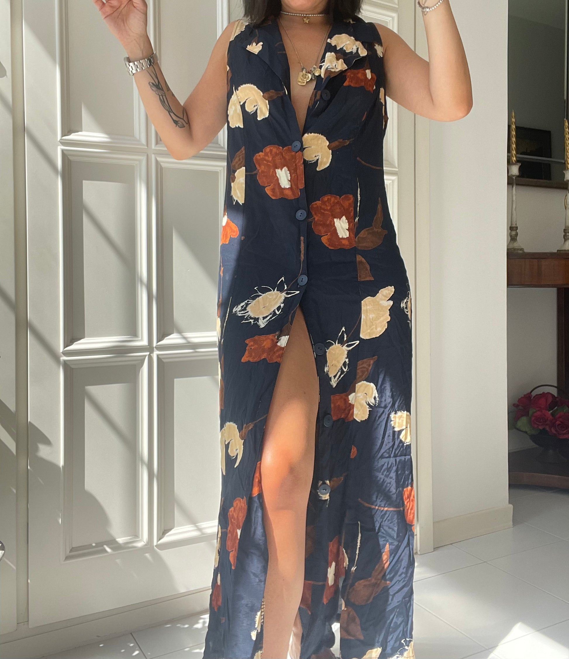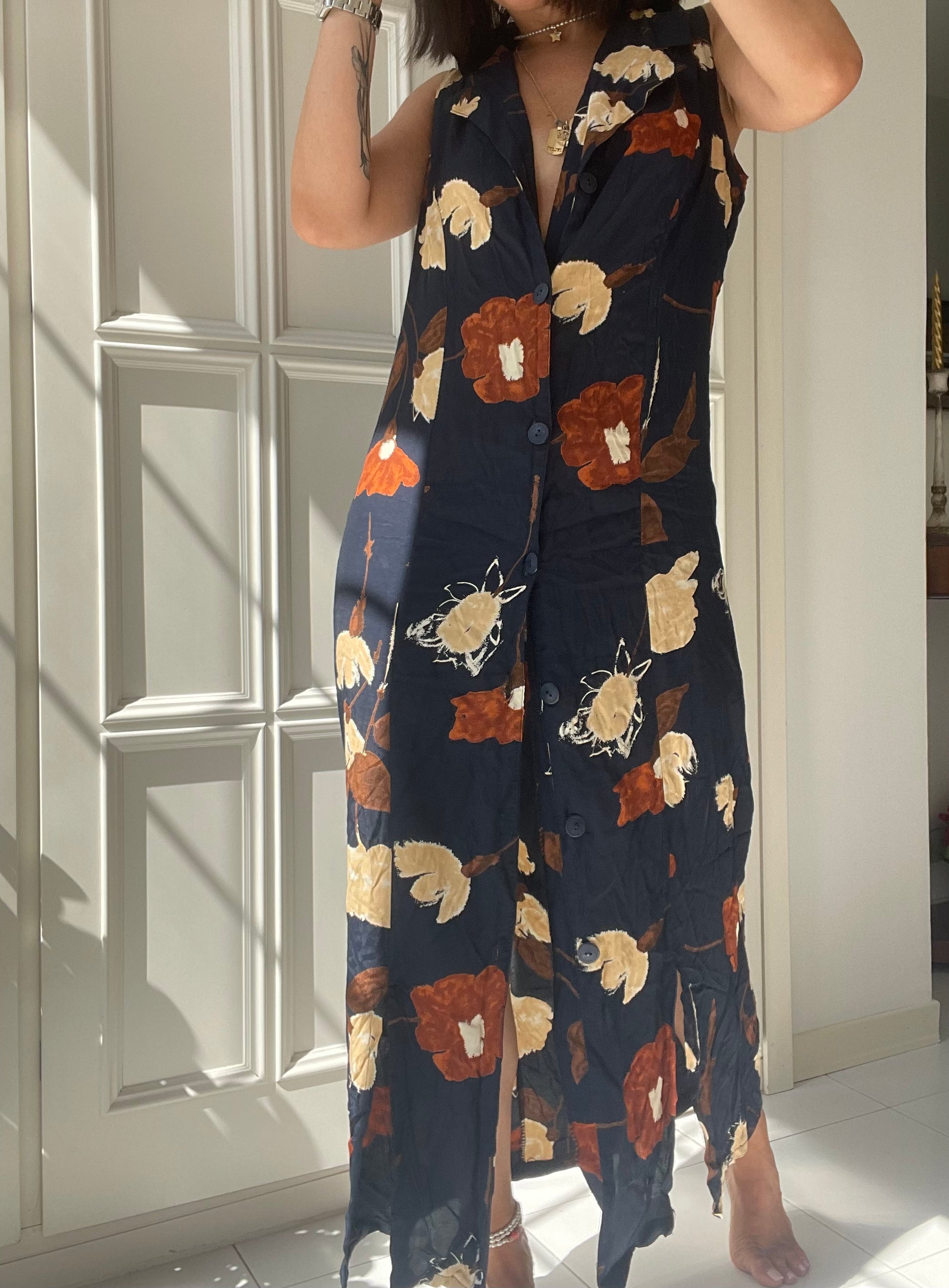 Abito vintage lungo con fantasia a fiori nei colori beige e marrone e nero