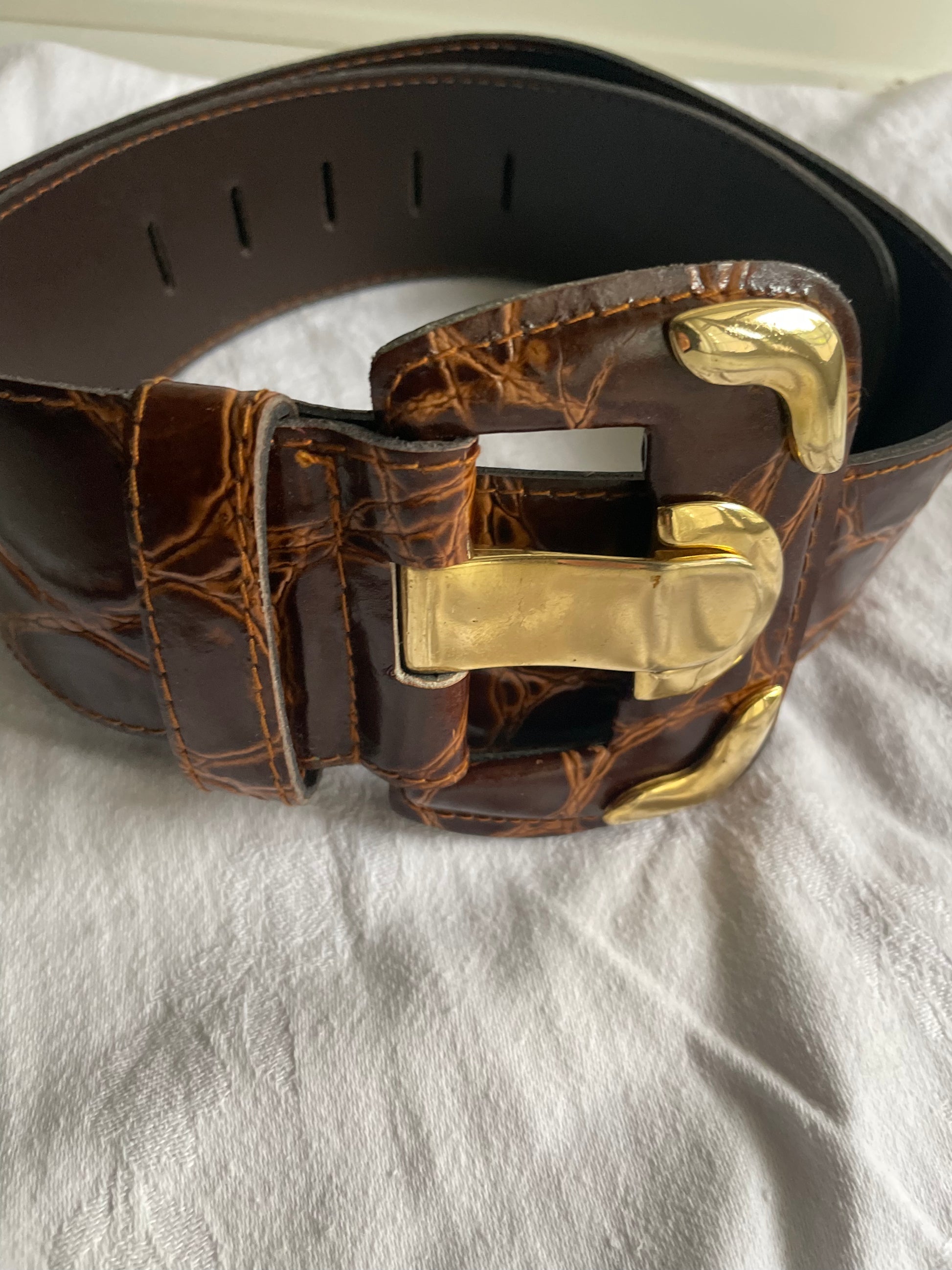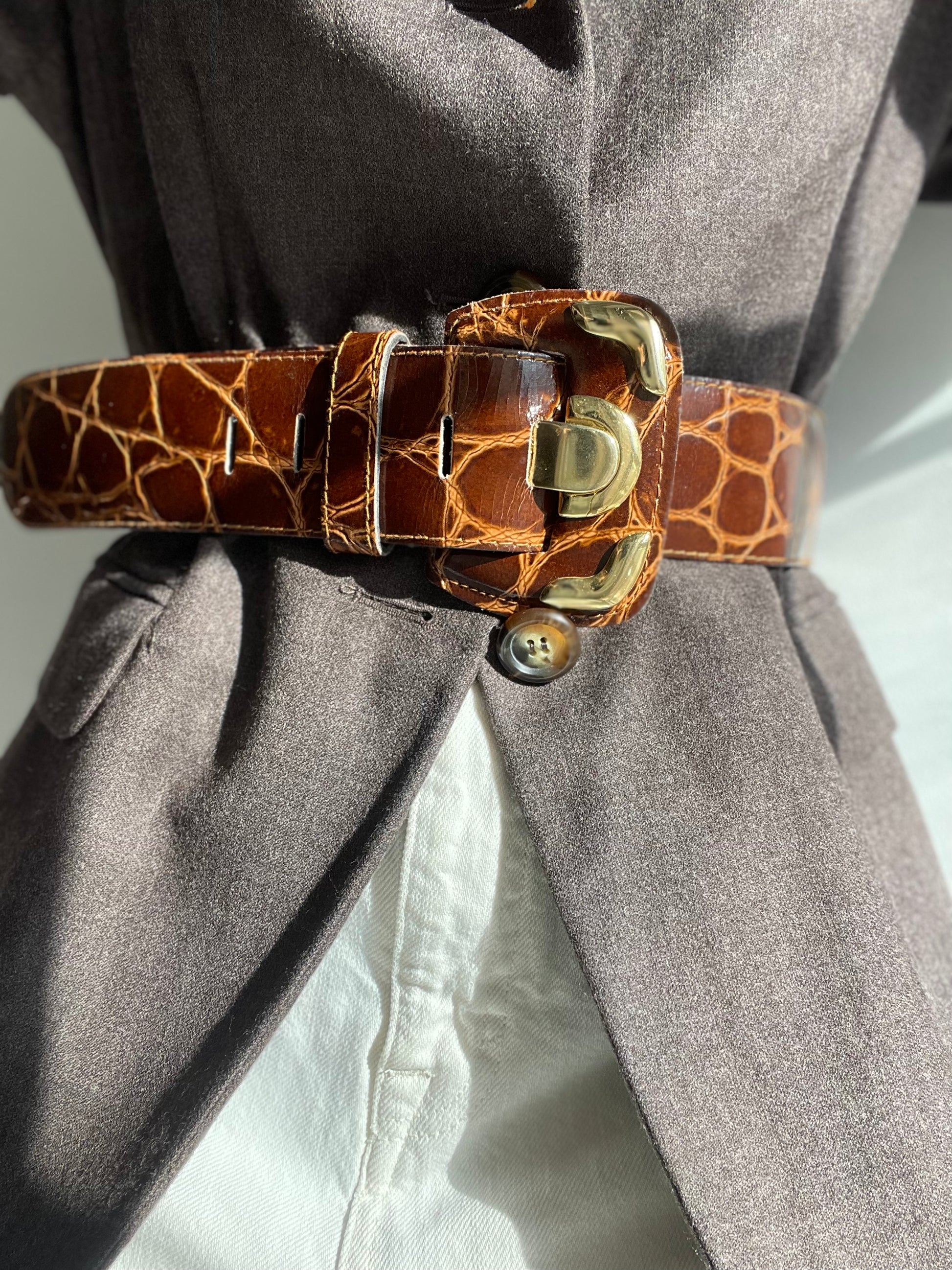 Cintura vintage in vera pelle com stampa coccodrillo colore marrone.